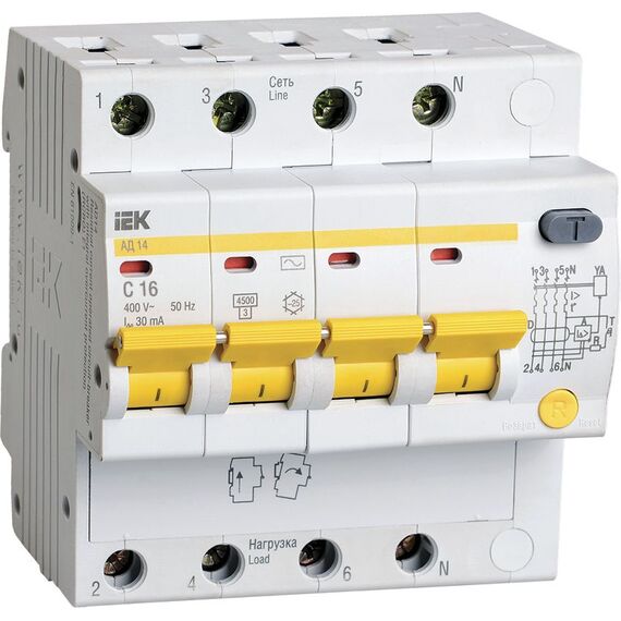 Выключатель автом. дифф. тока IEK MAD10-4-016-C-030 16A тип C 4.5kA 30мА AC 4П 230/400В 5мод белый