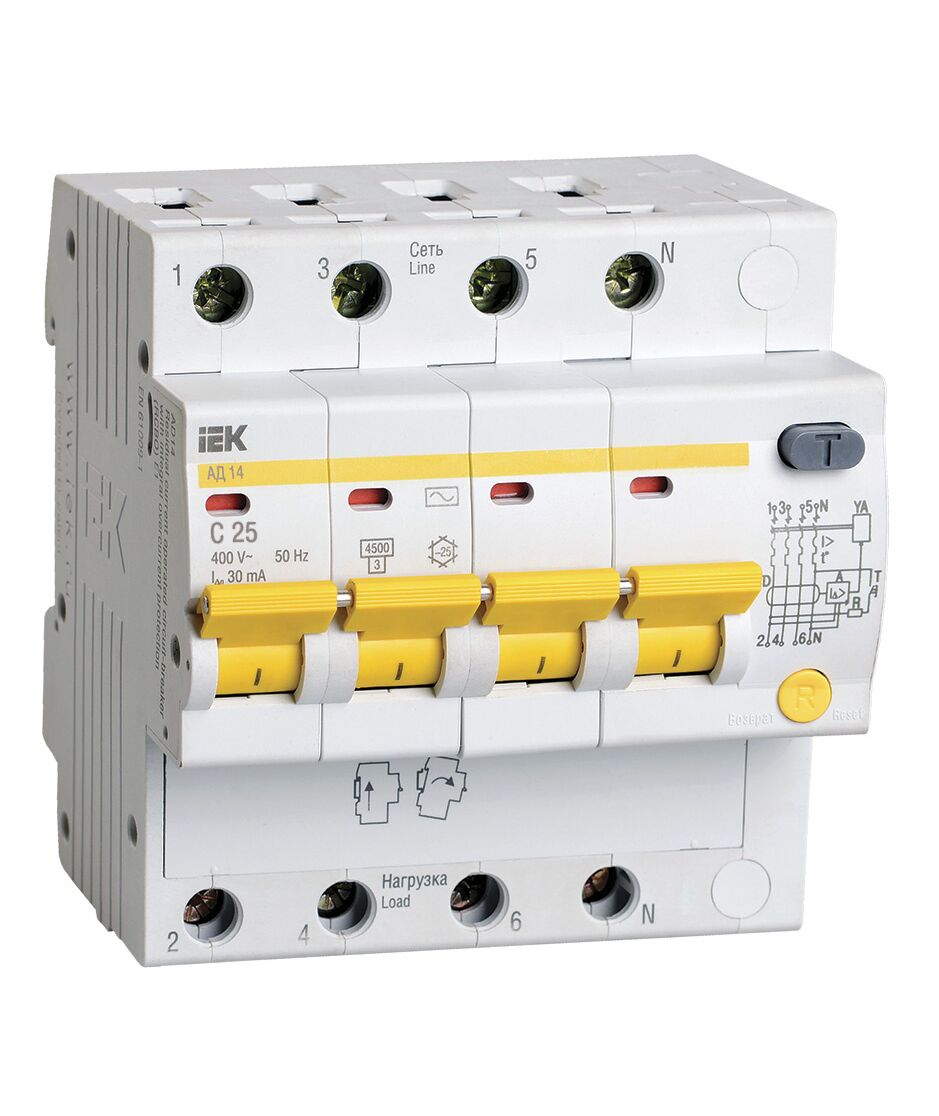 Выключатель IEK MAD10-4-025-C-030 автом. дифф. тока 25A тип C 4.5kA 30мА AC 4П 230/400В 5мод белый