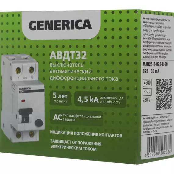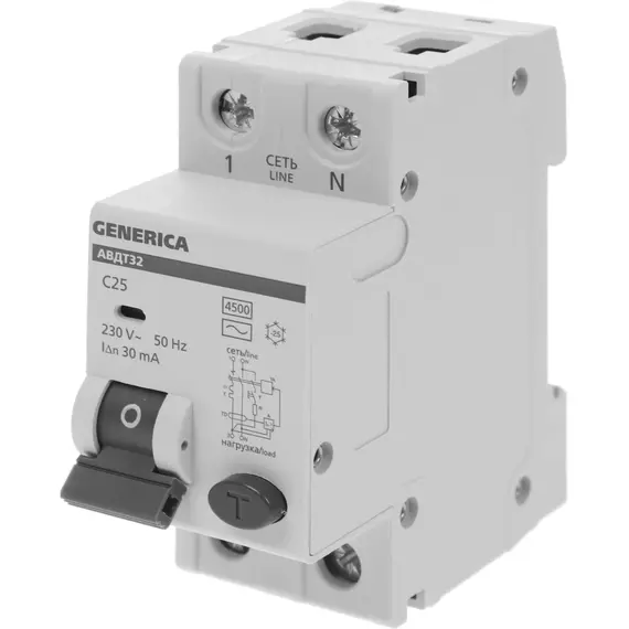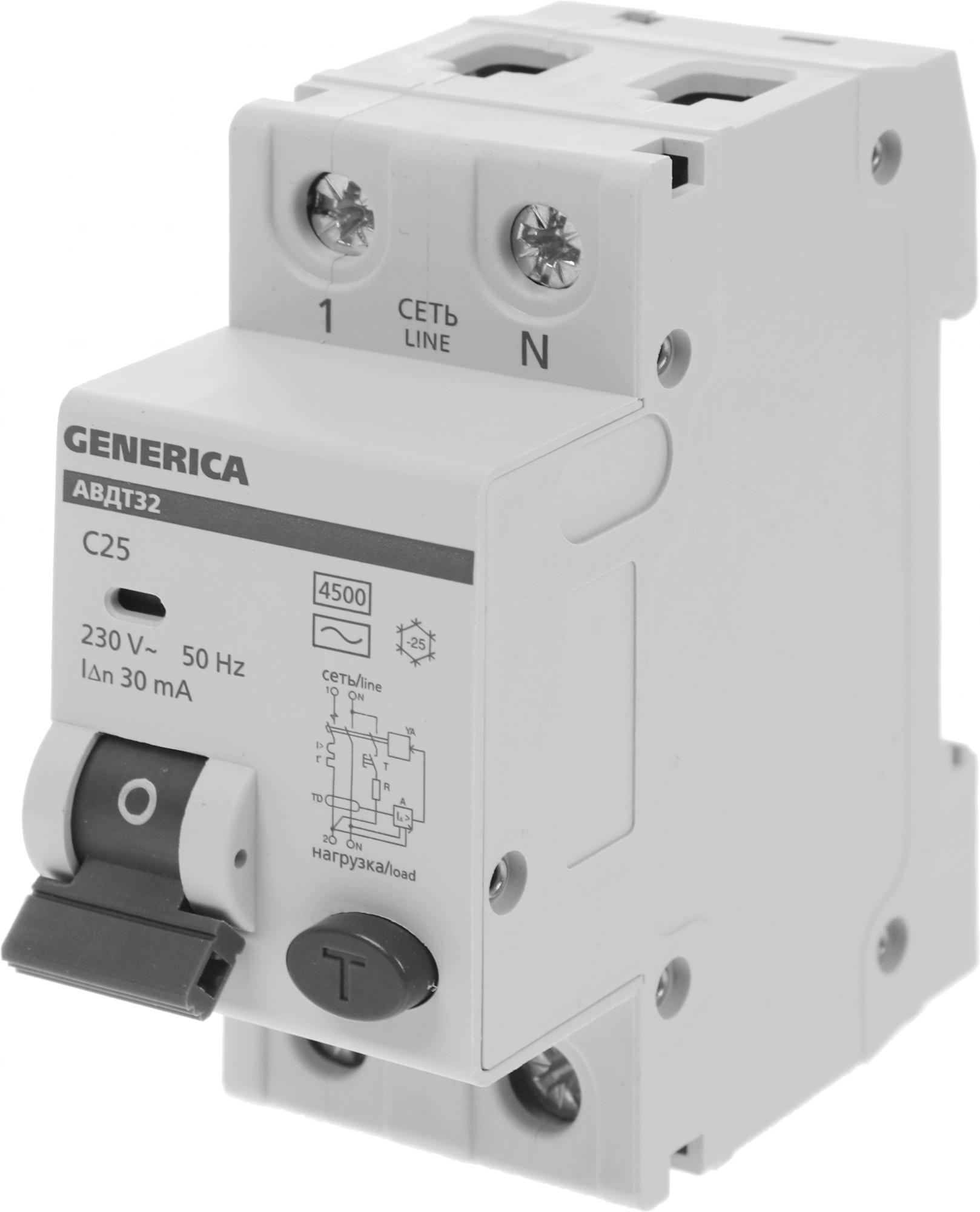 Выключатель IEK MAD25-5-025-C-30 автом. дифф. тока 32 Generica 25A тип C 6kA 30мА AC 2П 230В 2мод серый