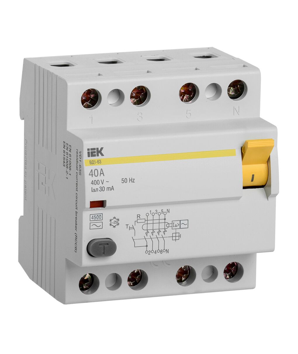 Выключатель дифф.тока УЗО IEK MDV10-4-040-030 ВД1-63 40A 30мА AC 4П 400В 4мод белый