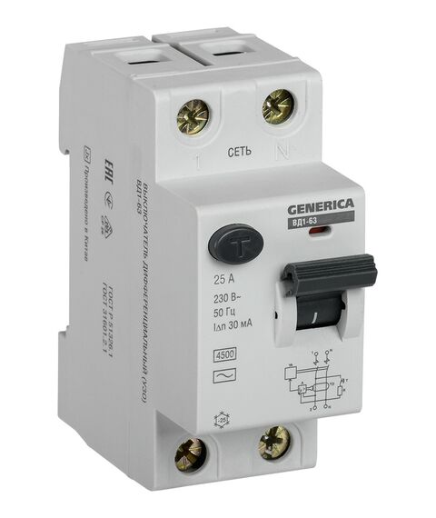 Выключатель дифф.тока IEK MDV15-2-025-030 Generica 25A 4.5kA 30мА AC 2П 230В 2мод серый