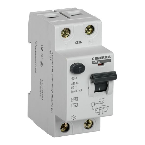 Выключатель дифф.тока IEK MDV15-2-040-030 ВД1-63 Generica 40A тип C 4.5kA 30мА AC 2П 230В 2мод серый