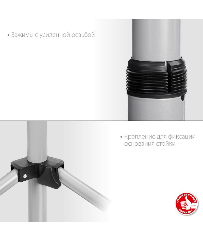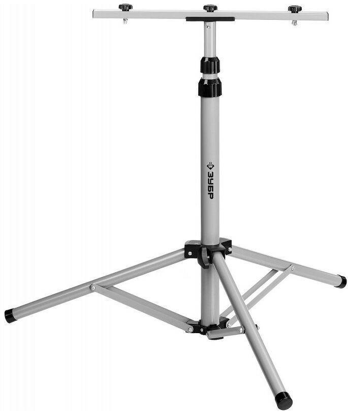 Штатив ЗУБР предназначен для установки прожекторов. Телескопическая конструкция позволяет регулировать высоту установки от 65 до 160 см. Горизонтальная перекладина позволяет одновременно установить 2 прожектора. Легкий и быстрый монтаж. Изготовлен из высокопрочной стали и выдерживает нагрузку до 8 кг. Размер в сложенном виде — 10х63 см. Диаметр основания треноги — 96 см.