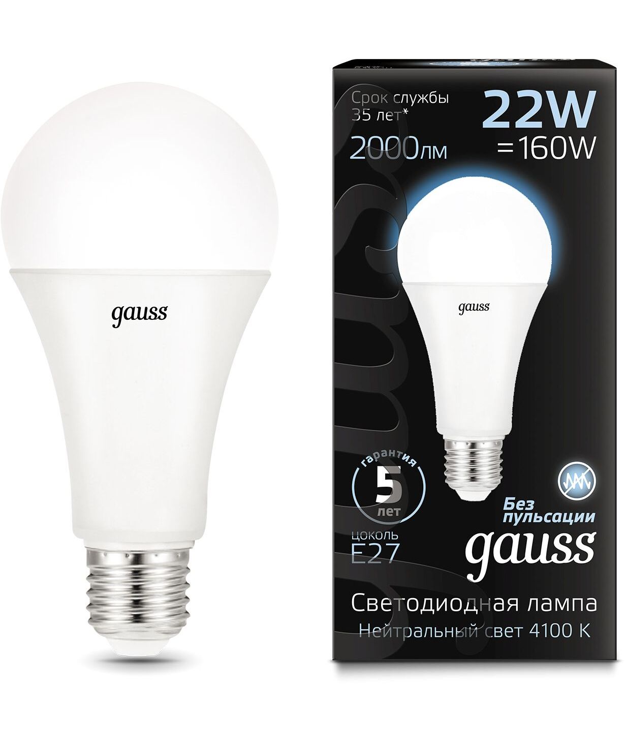 Лампа светодиодная Gauss 22Вт цок.:E27 шар 220B 4100K св.свеч.бел.нейт. A70 [102502222]