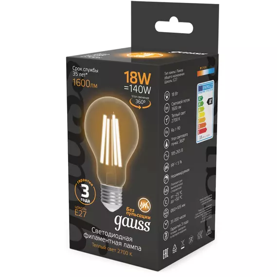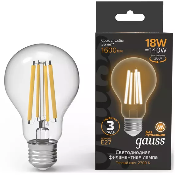 Лампа филаментная Gauss Filament 18Вт цок.:E27 груша 220B св.свеч.бел.теп. [102902118]