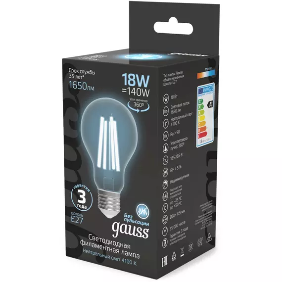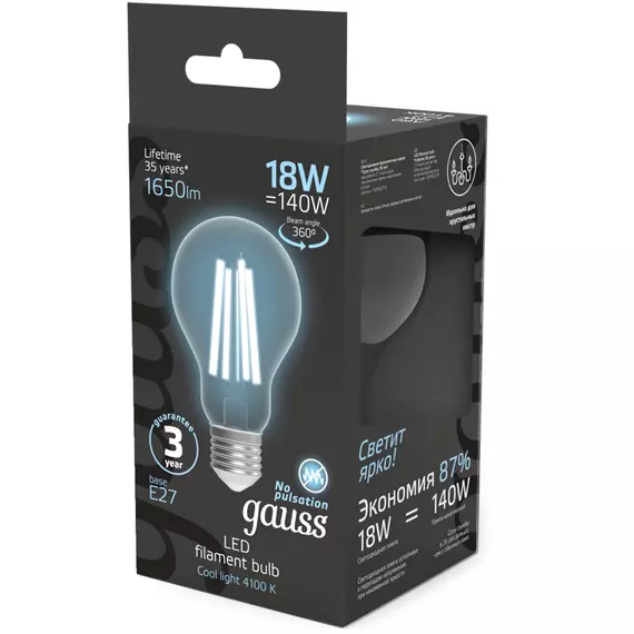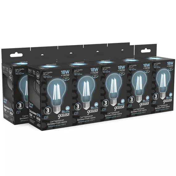 Лампа филаментная Gauss Filament 18Вт цок.:E27 груша 220B св.свеч.бел.нейт. [102902218]