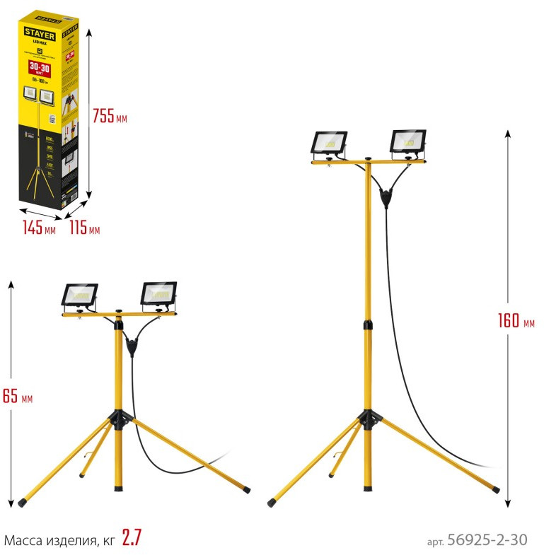 Прожекторы STAYER на штативе - осветительный прибор, состоящий из прочной и устойчивой треноги с двумя прожекторами на основе ярких, высокоэффективных и долговечных источников света. Корпус прожекторов выполнен из алюминиевого сплава литого под давлением, обеспечивающего высокую теплоопередачю. Конструкция прожектора защищена от пыли и влаги (IP65).