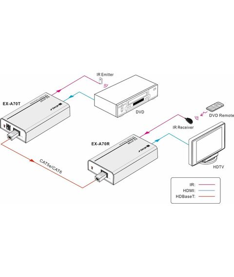 Комплект EX-A70 преобразует HDMI сигнал по стандарту HDBT и может передавать его по кабелю на витой паре на расстояние до 70 метров. Обратное преобразование осуществляется приемником входящим в комплект.