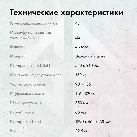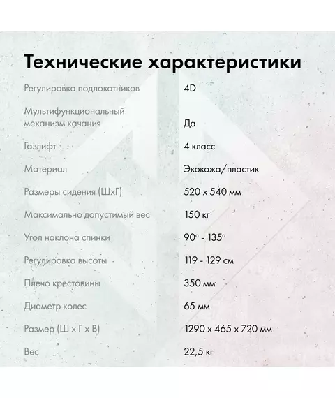 | Тип механизма качания | "синхронный" качание с синхронным отклонением сидения и спинки 1:3 и фиксацией в нескольких положениях |