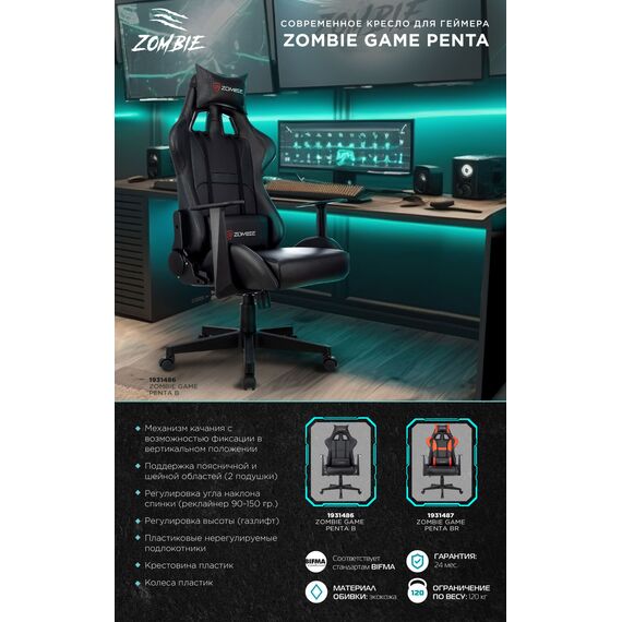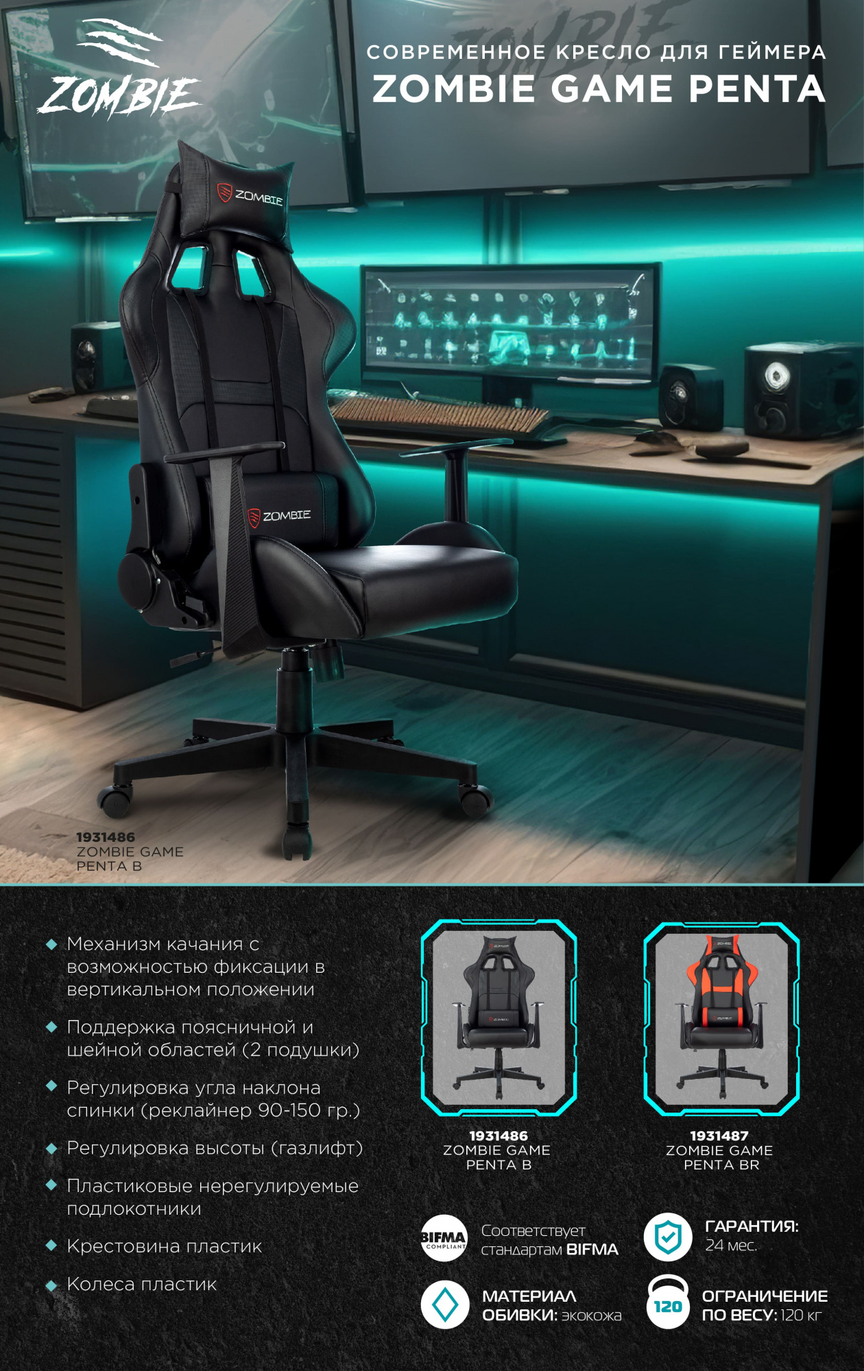 Кресло игровое Zombie GAME PENTA BR черный/красный эко.кожа с подголов. крестов. пластик