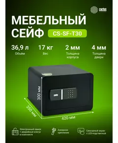 Характеристики Назначение мебельный Тип сейфа взломостойкий Замок электронный Цвет черный Материал корпуса металл Вес товара 17 кг Особенности с сенсорным управлением Размер внешний 300x420x350мм Размер внутренний 296x416x300 Общий объем 36.9 л...