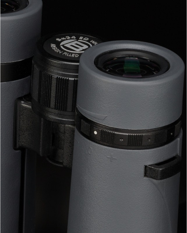 - Конструкция корпуса – это так называемый «открытый мост». Половинки бинокля соединяются двумя усиленными шарнирами, а не одной сплошной перемычкой. С одной стороны, это позволяет прибору оставаться таким же прочным и надежным, с другой – уменьшает его вес и улучшает захват. Бинокль не пропускает воду (класс защиты – IPX7) и может спокойно выдержать кратковременное погружение в водоем на глубину до 1 метра. Внутреннее пространство заполнено аргоном – этот газ, как и азот, помогает бороться с конденсатом, но делает это более эффективно.
