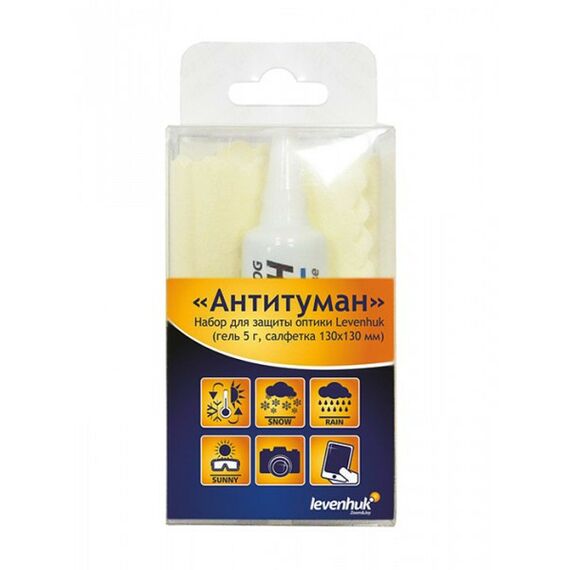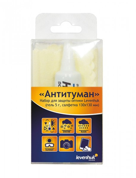 В неблагоприятных погодных условиях оптические поверхности быстро запотевают. Набор Levenhuk «Антитуман» предотвращает образование конденсата на всех видах линз. Для обработки оптики достаточно выдавить немного геля на линзу и вытереть ее насухо салфеткой.