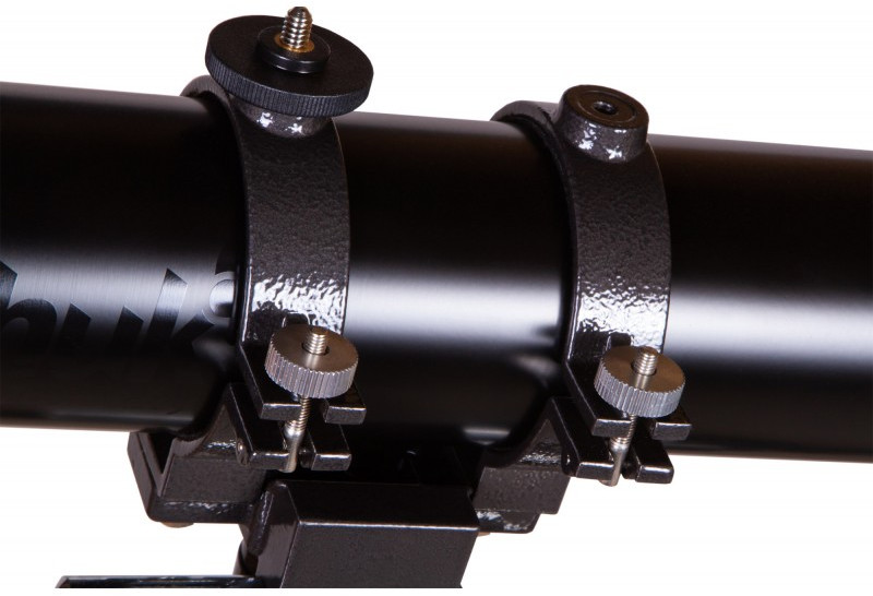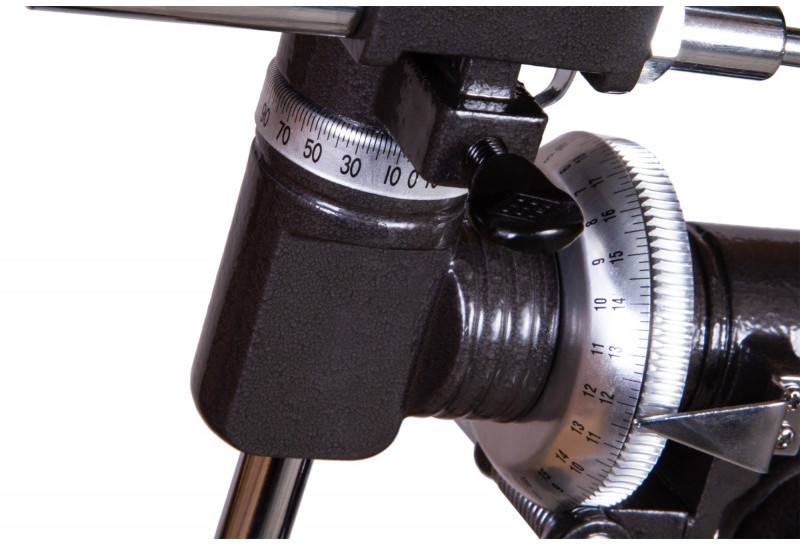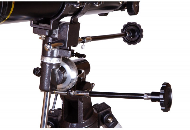 - Оптическая труба телескопа установлена на экваториальную монтировку, которая хорошо подходит для изучения космоса. На освоение управления требуется время, но ведение астрономических объектов происходит просто и удобно. У монтировки плавный и мягкий ход, оптическая труба крепится надежно и прочно. Тренога сделана из алюминия, высоту ее ножек можно настраивать под рост наблюдателя. Есть лоток для аксессуаров.