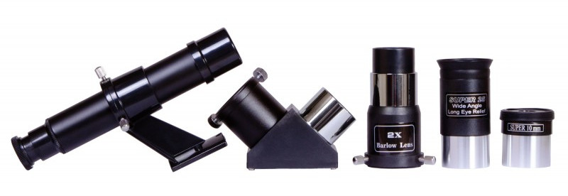 - Богатая комплектация: два окуляра, линза Барлоу, диагональное зеркало