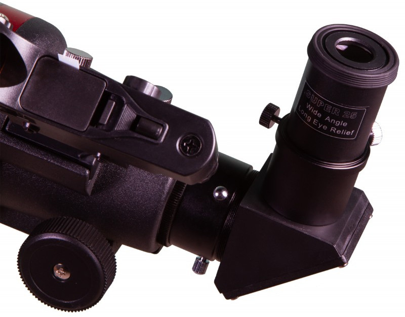 - Ахроматическая оптика эффективно борется с цветовыми искажениями, позволяя видеть мелкие детали более четко и ясно. Телескоп отлично справляется с передачей картинки ближнего космоса, хорошо подходит для наблюдений за наземными объектами и может использоваться для исследования дальних уголков Вселенной. В комплект поставки включены необходимые аксессуары: два окуляра, диагональное зеркало и искатель с красной точкой.