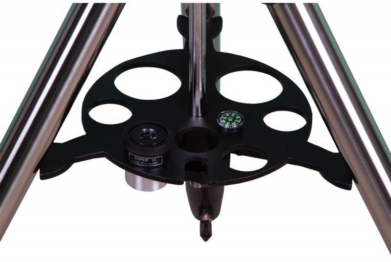 - Телескоп установлен на автоматизированную монтировку. Важная особенность – наличие двойных энкодеров, которые упрощают ее настройку. При переходе на ручное управление информация о первоначальном позиционировании не теряется, поэтому во время наблюдений не нужно ничего дополнительно подстраивать и корректировать. Тренога выполнена из стали, она устойчивая и надежная. Высоту ножек треноги можно регулировать. Есть лоток для аксессуаров.