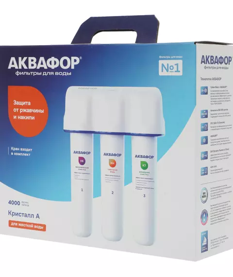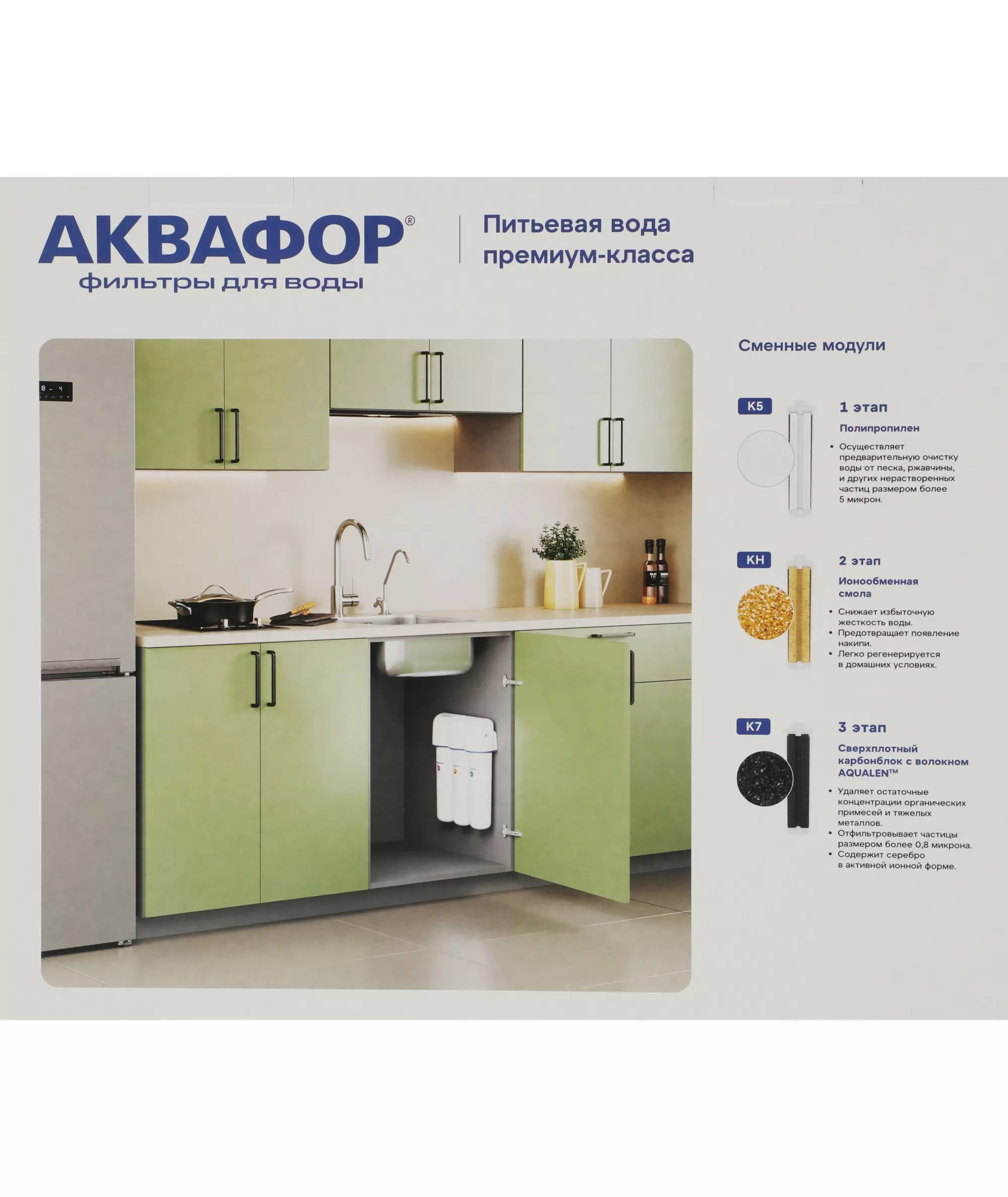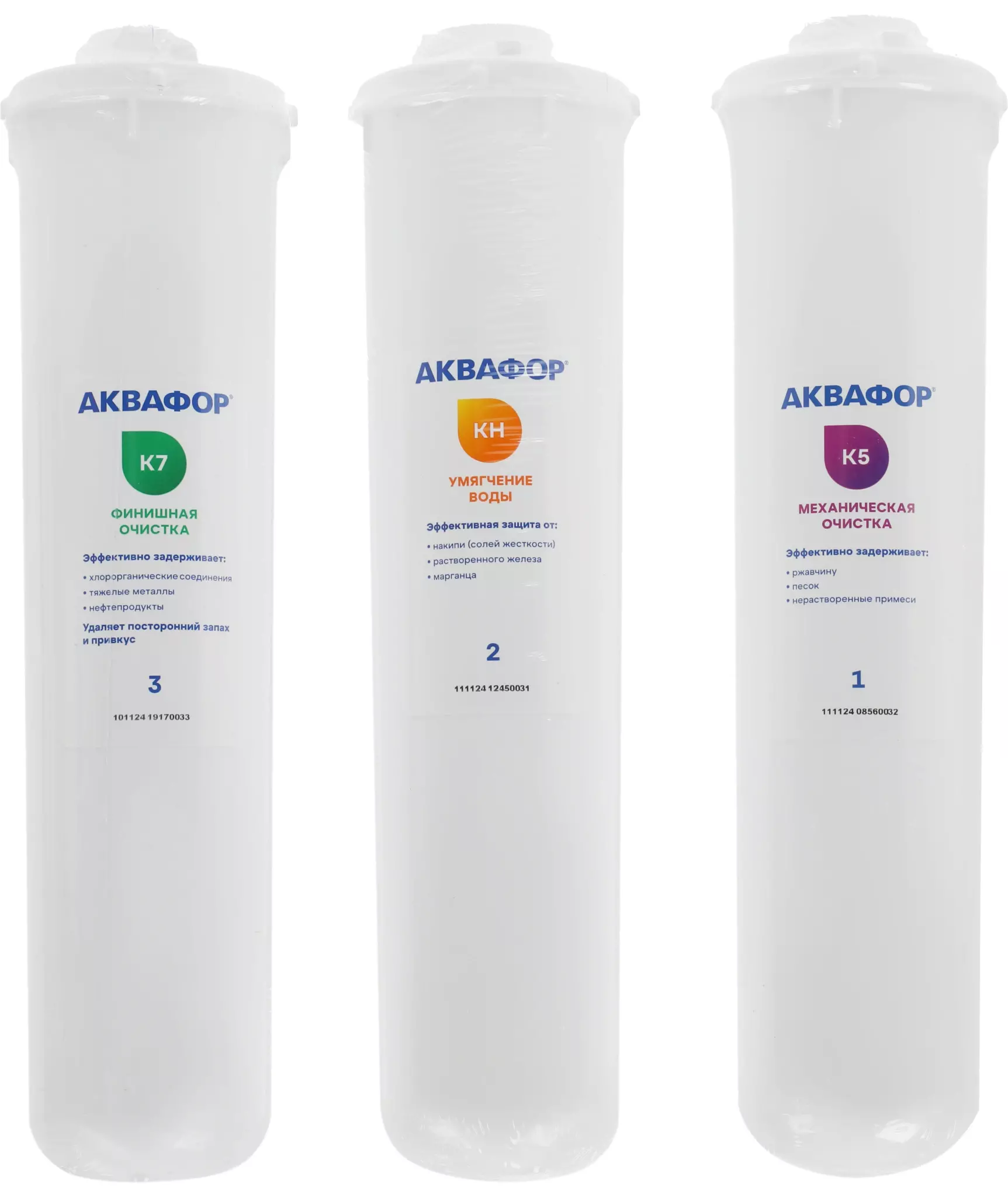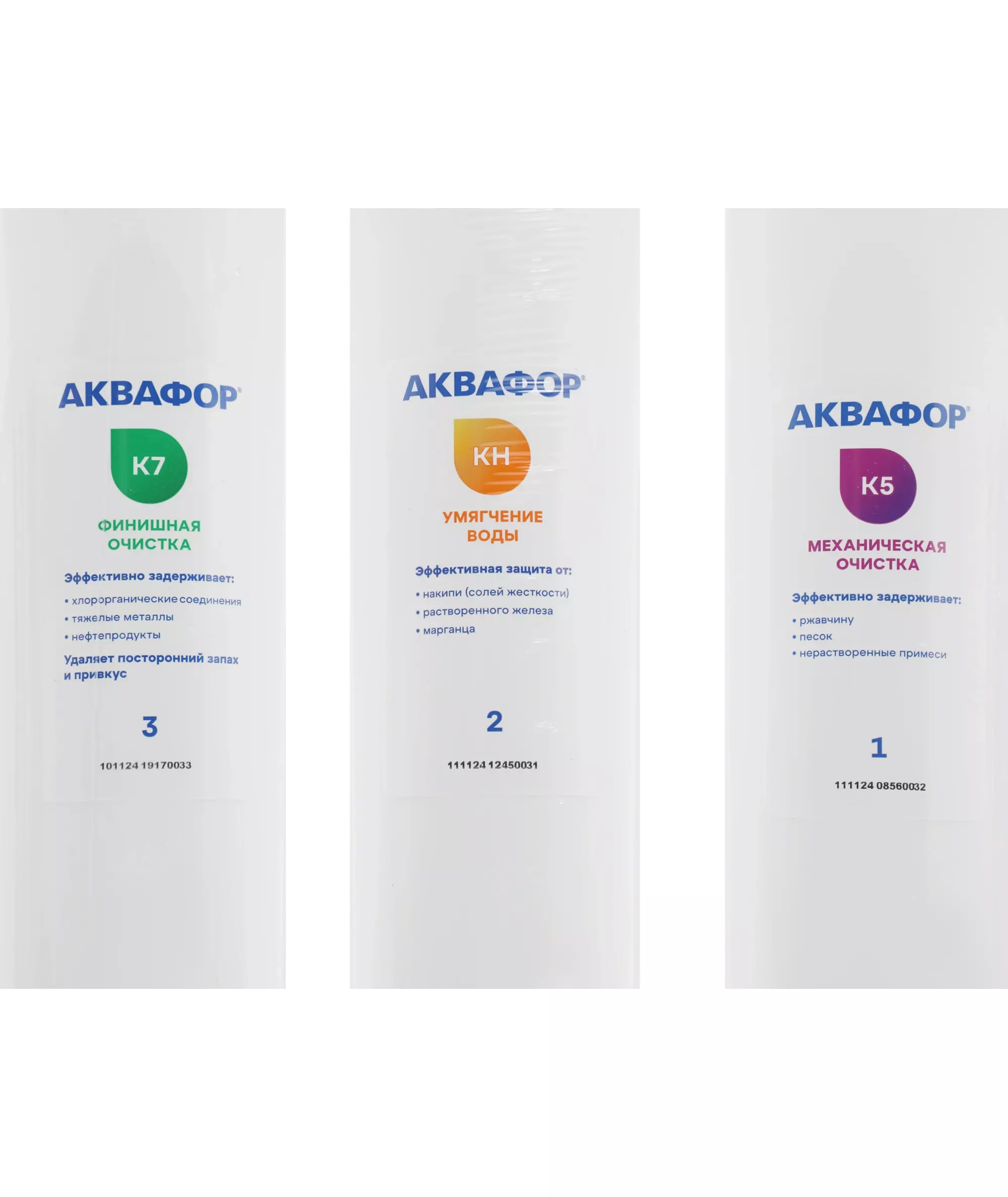 В комплект картриджей входят три модуля: K5 - предварительная очистка; KH - для умягчения воды умеренной или средней жесткости; K7 - финишная очистка.