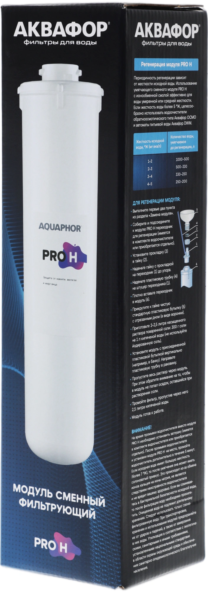 Модуль Pro Н умягчает воду и замедляет процесс образования известкового налета. Он поможет избавиться от назойливой радужной пленки, которую образуют соли жесткости на поверхности воды. Модуль удаляет железо Fe2 и марганец. Его легко регенерировать самостоятельно и делать это можно многократно.