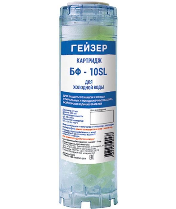 Картридж БФ используется для связывания солей жесткости и растворимого железа в воде для технических нужд. Это обеспечивает защиту нагревательных элементов стиральных, посудомоечных машин и водонагревателей от накипи. По мере использования полифосфат медленно растворяется в воде.