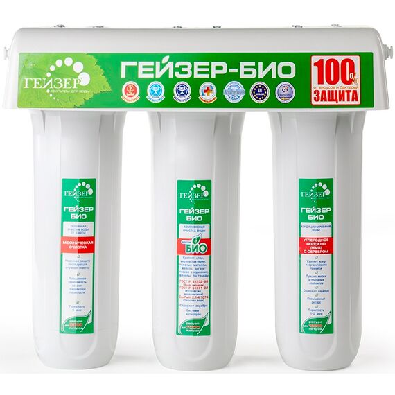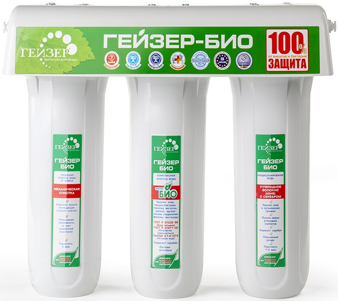 Трехступенчатый фильтр "Гейзер Био 341" для очистки воды с повышенным содержанием железа. Признаки присутствия железа в воде: хлопья ржавчины, бурый осадок при отстаивании, характерный привкус и запах железа, ржавые подтеки на сантехнике. Самая совершенная и оптимальная система очистки воды.