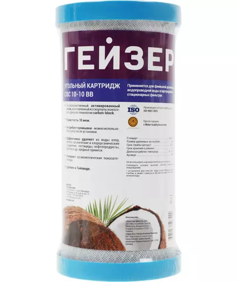 Изготовлен из высококачественного кокосового активированного угля по технологии карбон-блок, что обеспечивает глубокую очистку воды от хлора, органических и хлорорганических соединений. Устраняет неприятные запахи и улучшает вкус воды. Сертифицирован американской ассоциацией NSF.