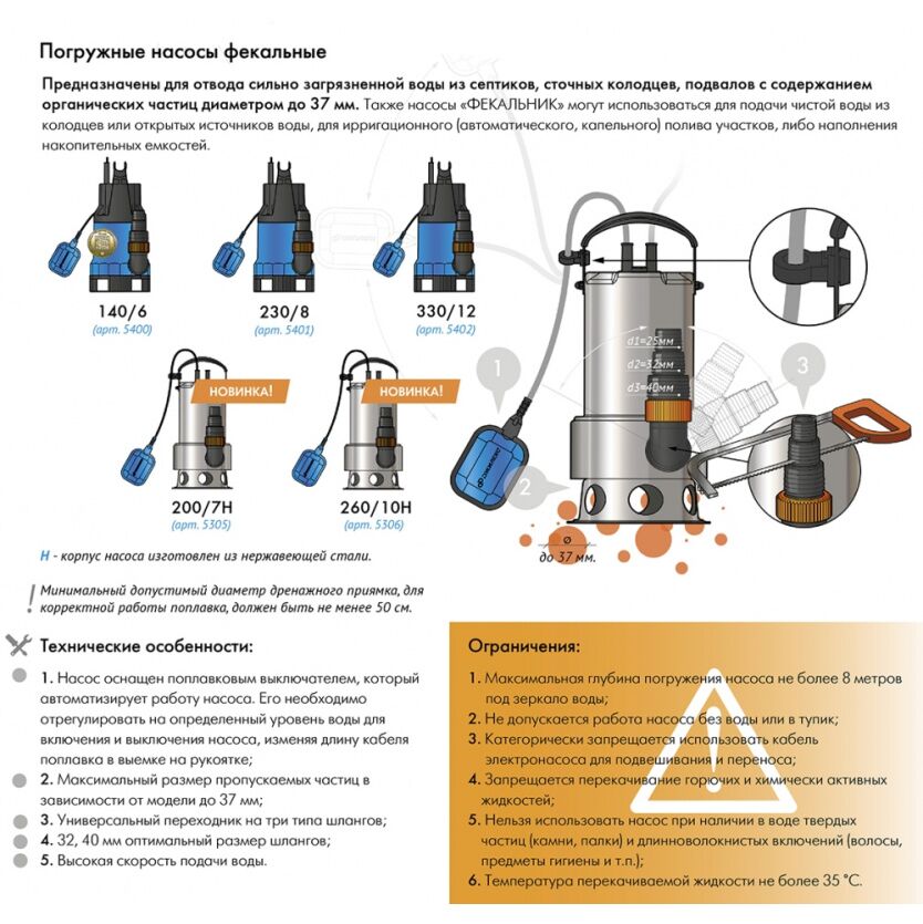 | Особенности | Предназначен для отвода сильно загрязненной воды из септиков, сточных колодцев, подвалов с содержанием органических частиц диаметром до 37 мм. Оснащен поплавковым выкл. Корпус насоса изготовлен из нержавеющей стали. |