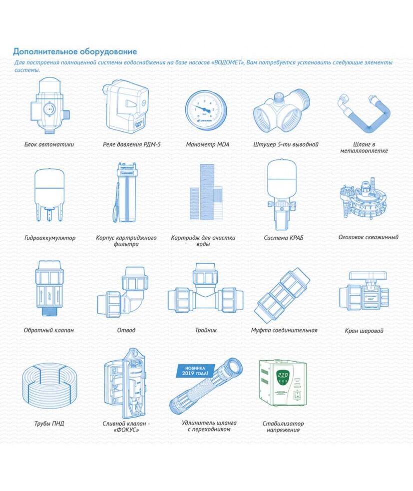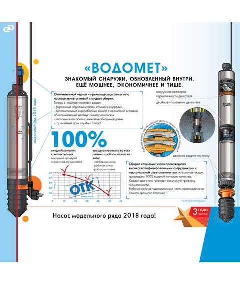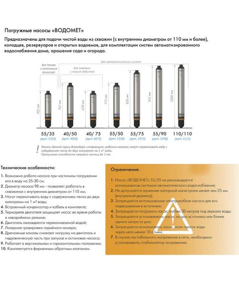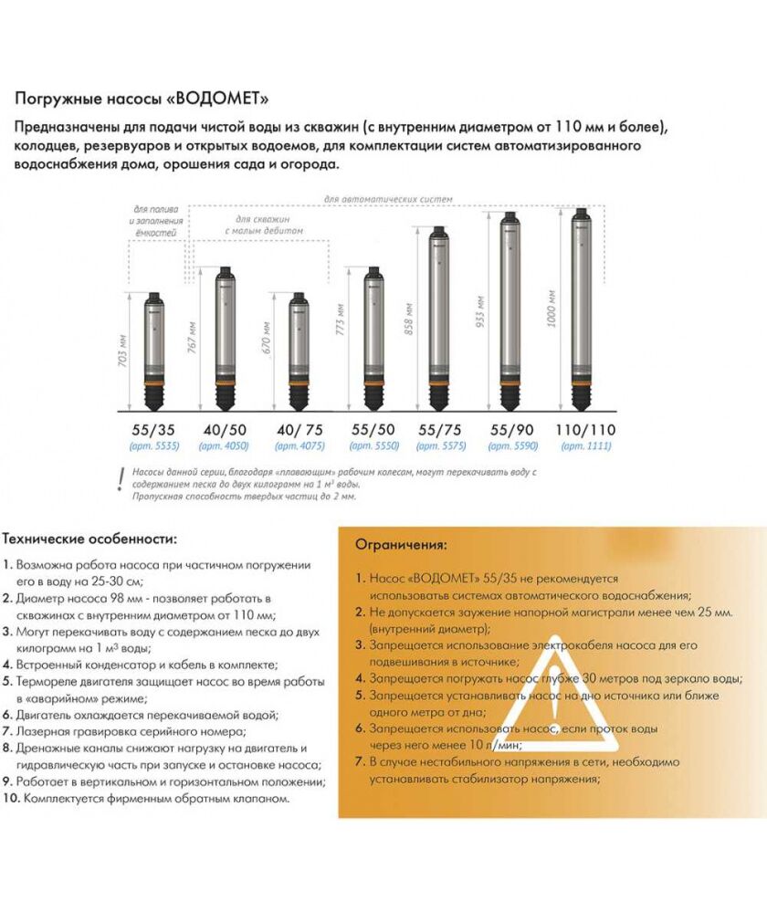 | Особенности | "ВОДОМЕТ" 40/50 ок, предназначен для подачи чистой воды из скважин (диаметром от 110 мм и более), колодцев, резервуаров и открытых водоемов, для комплектации систем автоматизированного водоснабжения дома, орошения сада. Способен работать в частично погруженном состоянии! |