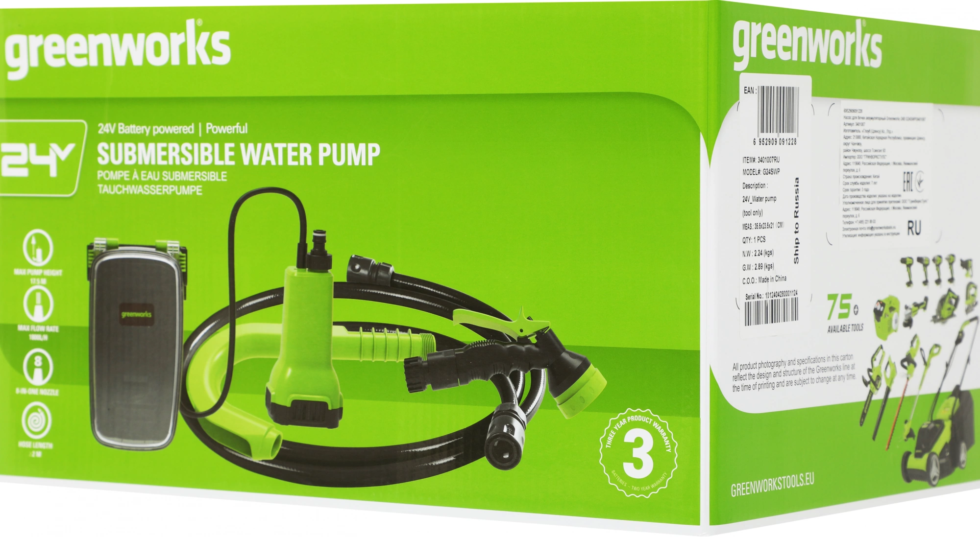 Насос бочечный Greenworks G24SWP 100Вт, 1800л/час [3401007]