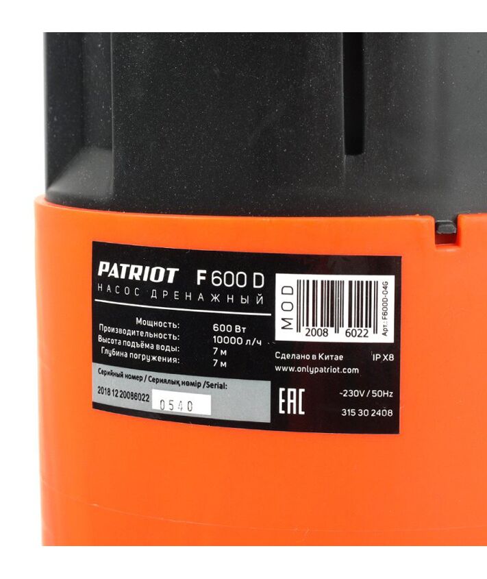 Насос центробежный Patriot F 600 D 600Вт 10000л/час [315302406]