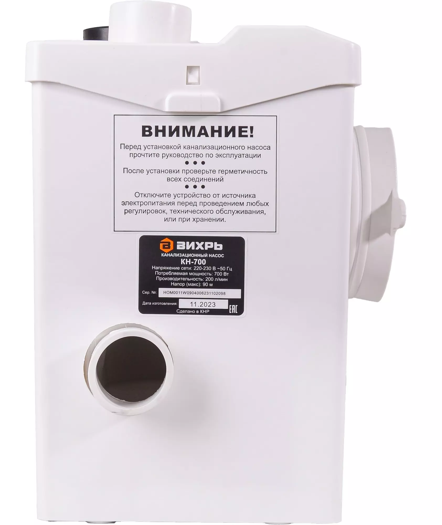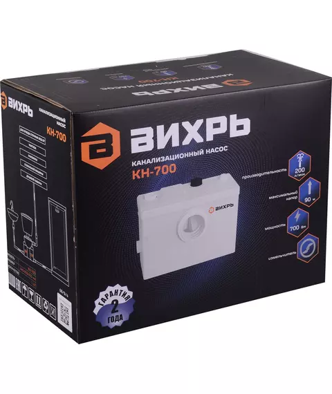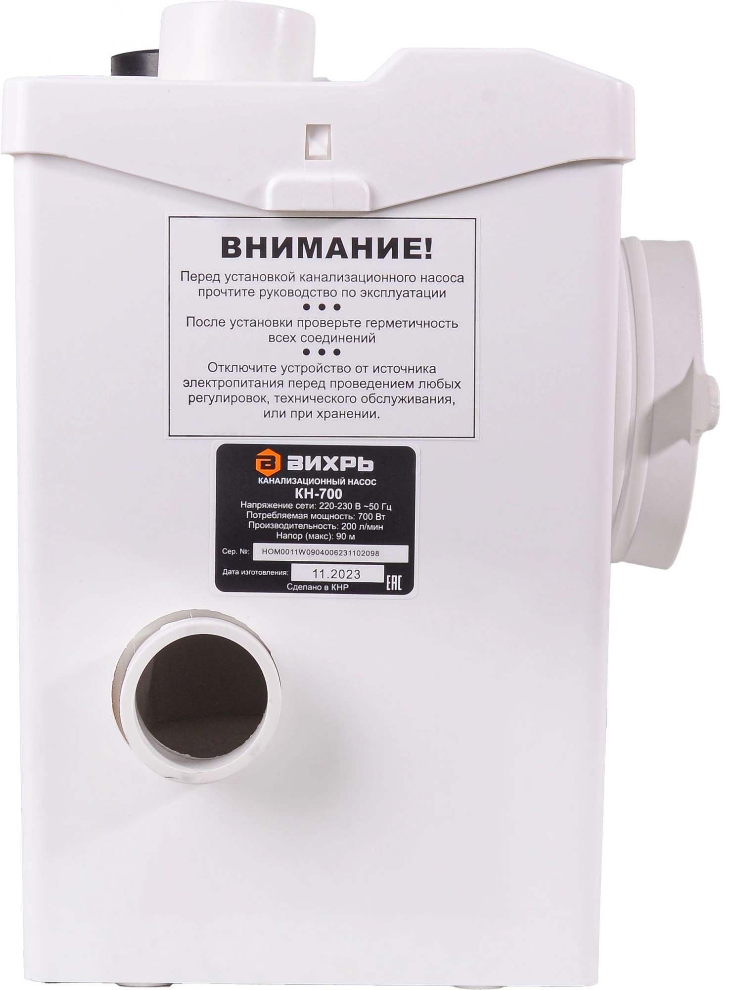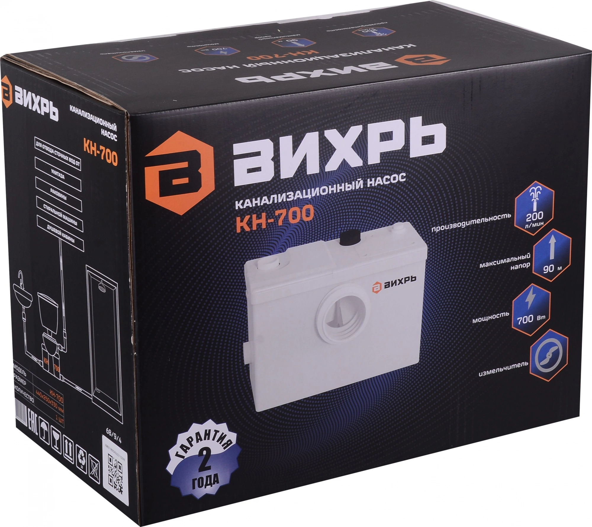Канализационный насос Вихрь КН-700 700 Вт, 200 л/мин, макс. напор по вертикали 9 м, по горизонтали 90 м, 2 входа, до +60 °С