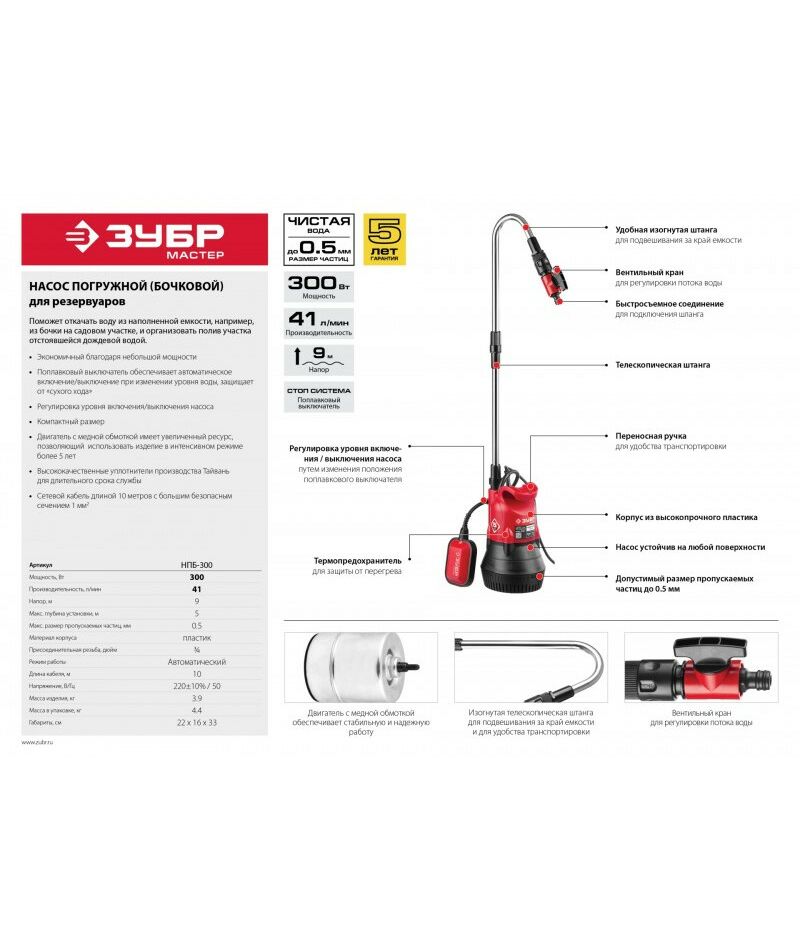 Дренажный насос для резервуаров Зубр НПБ-300 300 Вт