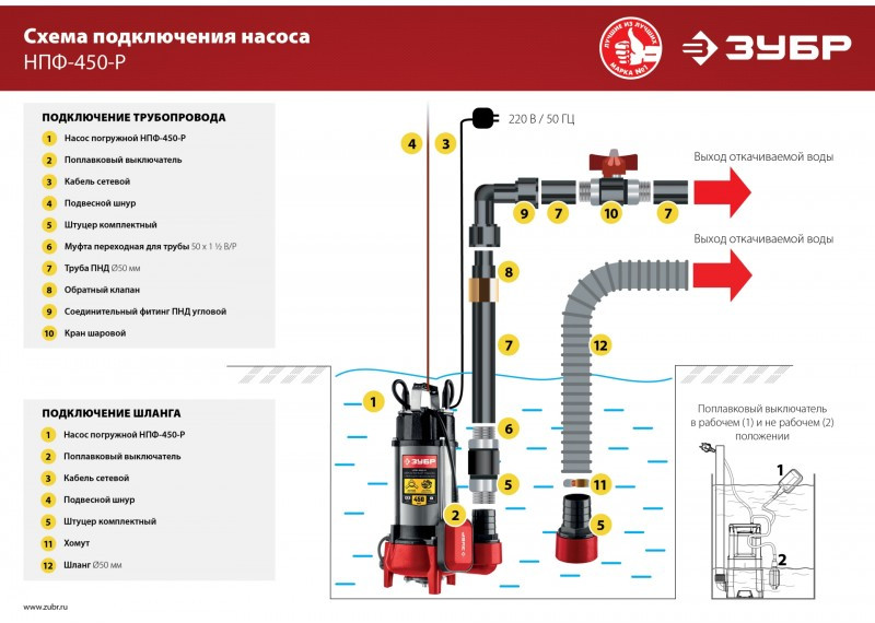 - Поплавковый выключатель обеспечивает автоматическое включения/выключения при изменении уровня воды