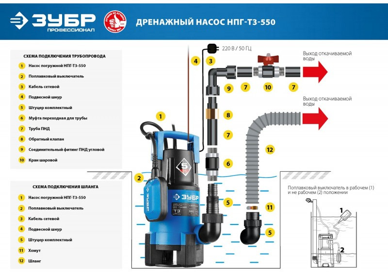 Дренажный насос для грязной воды Зубр Профессионал НПГ-Т3-550 550 Вт