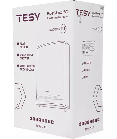 Объем 40 литров, с двойным баком плоской формы глубиной всего 28 см, медным ТЭНом мощностью 2,2 кВт и универсальной установкой, от европейского производителя TESY, c покрытием бака Crystal Tech и безусловной гарантией от протечек 7 лет!