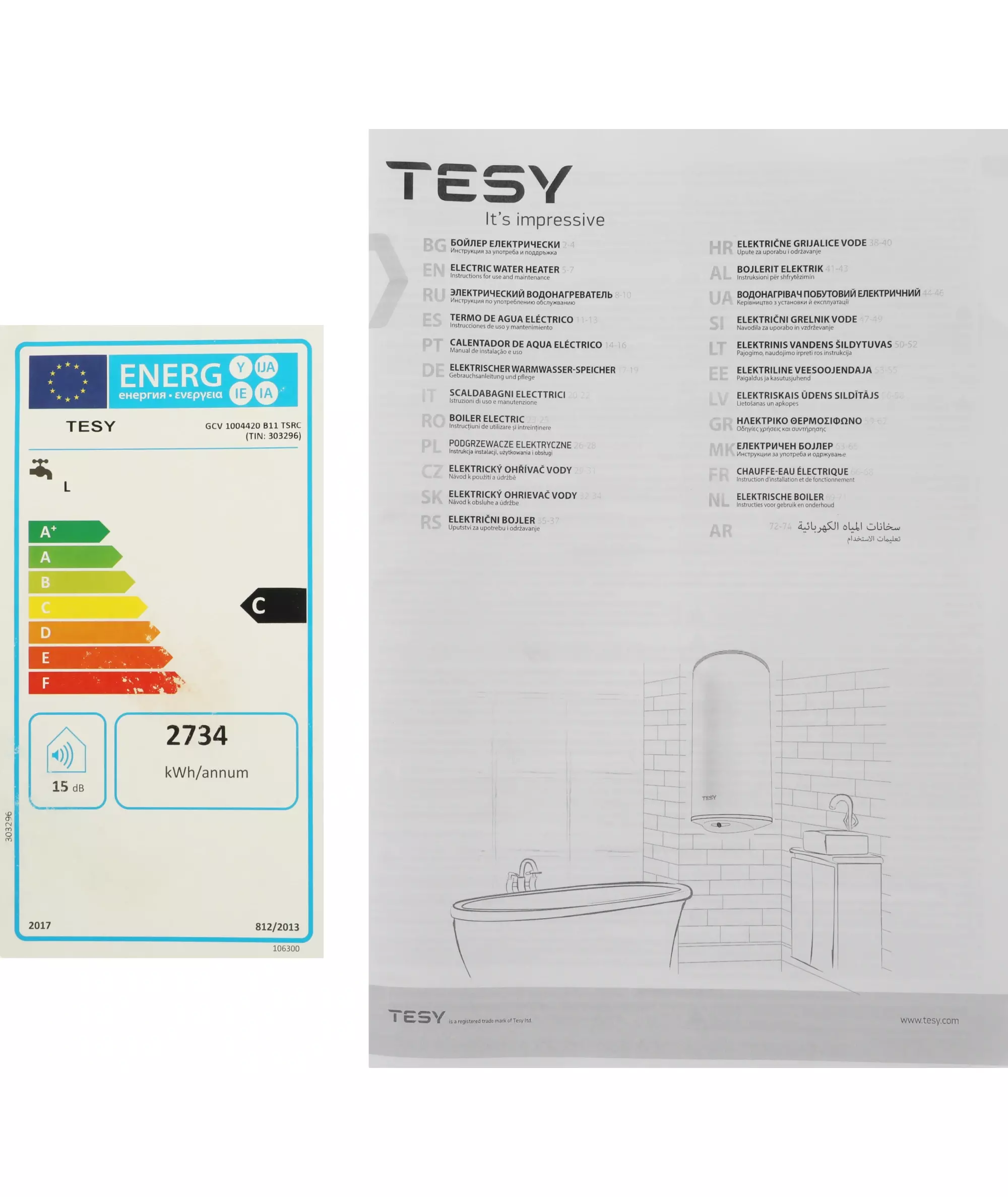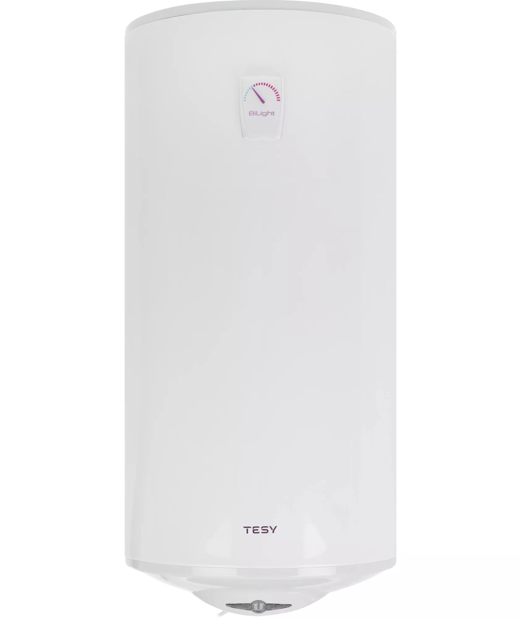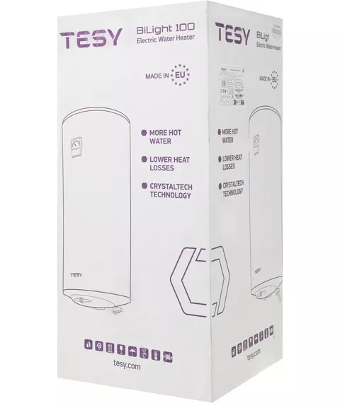 Объем 100 литров, корпус стандартного диаметра 44 см, с механическим управлением, медным ТЭНом мощностью 2,0 кВт и вертикальной установкой, от европейского производителя TESY, c инновационным стеклокерамическим внутренним покрытием бака Crystal Tech.