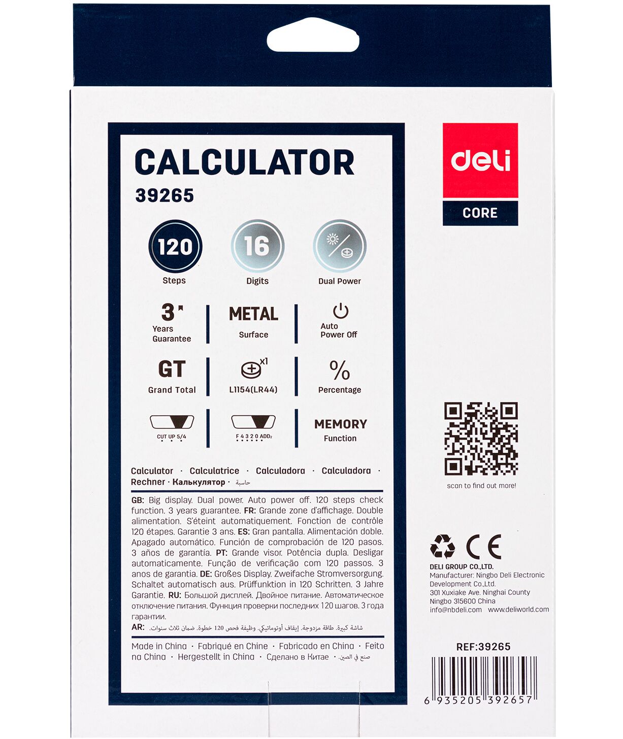 Калькулятор бухгалтерский Deli E39265 серый 16-разр.
