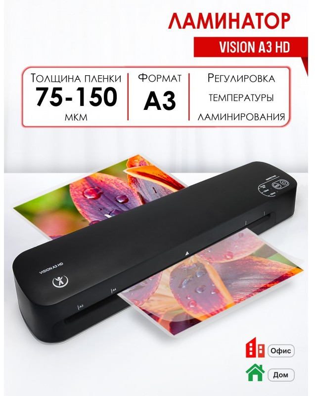 - Vision A3 HD предназначен для ламинирования объявлений, указателей, меню, пропусков, бэджей и другой печатной продукции. Отличный выбор для дома, офисов и организаций с небольшим объемом работ.