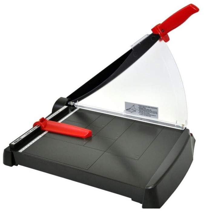 - Качественный и надежный сабельный резак для бумаги: увеличенный рабочий стол с разметкой форматов; защитный экран; упор для бумаги (ограничительная планка)
