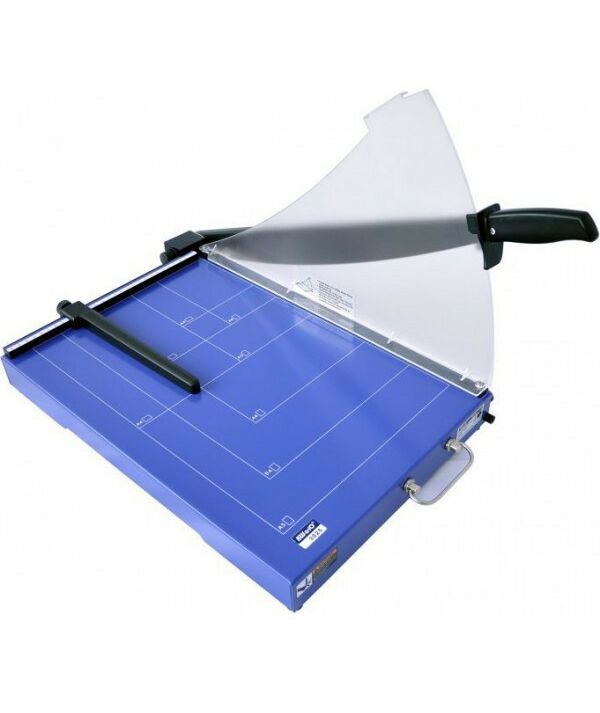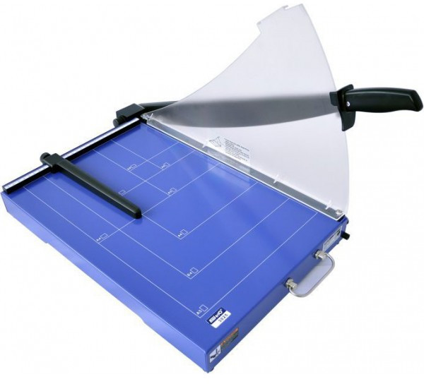 Большой металлический стол с разметкой форматов, фиксация ножа в закрытом состоянии, защитный экран, упор для бумаги (ограничительная планка), ручка для переноски. Для офисов и организаций со средним и большим объемом работ.