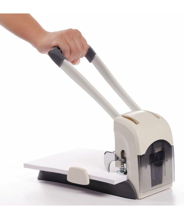 | Особенности | пробитие 4-х отверстий в два приема, отсек для хранения ножей, быстрая смена ножей без инструментов, механизм позволяющий прилагать вдвое меньше усилий для пробития отверстий |