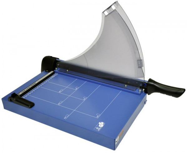 Большой металлический стол с разметкой форматов, автоматический прижим бумаги, массивный нож с фиксацией в закрытом состоянии, упор (ограничительная планка) для бумаги. Резак отлично подходит офисов и типографий со средним и большим объемом работ.