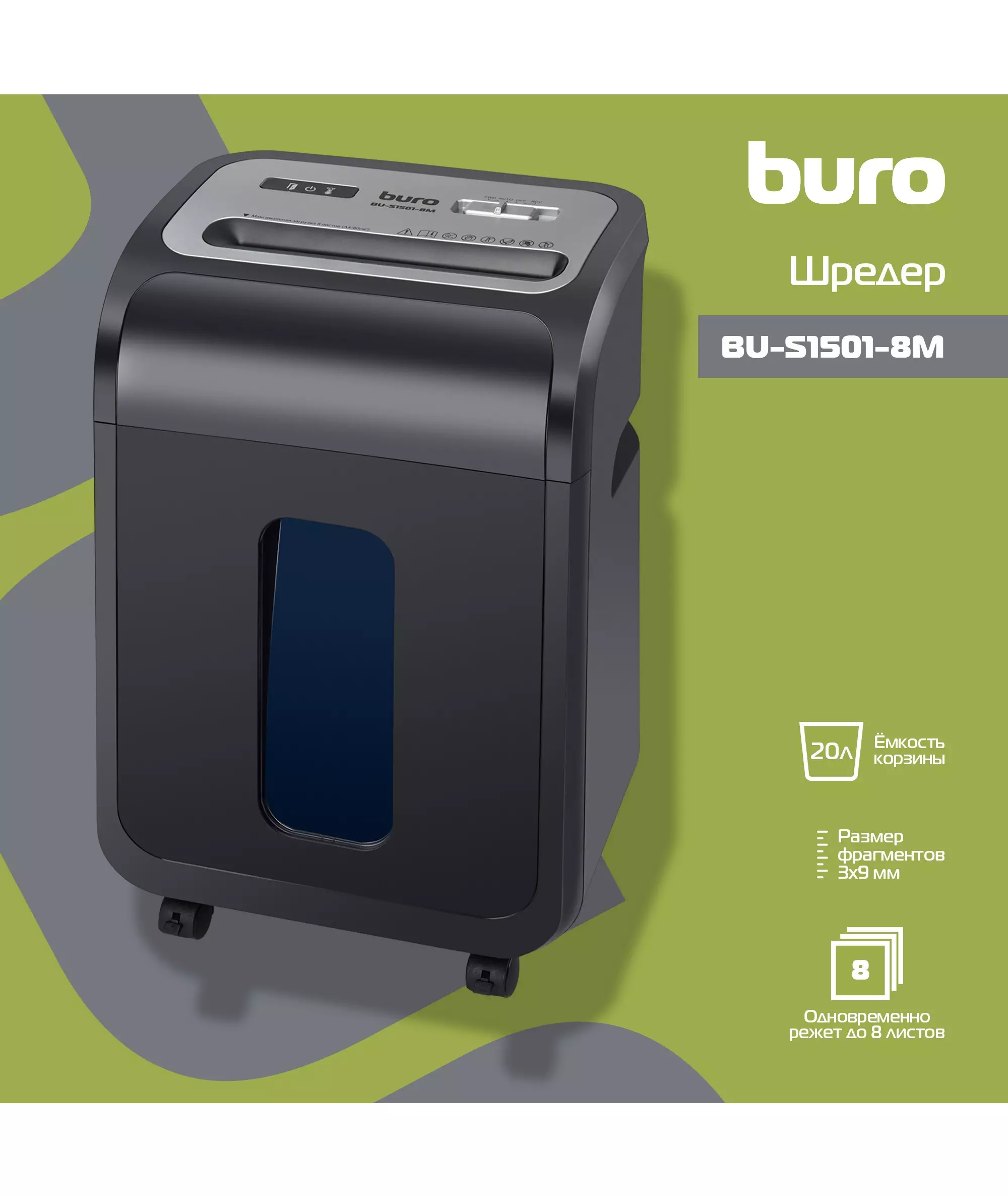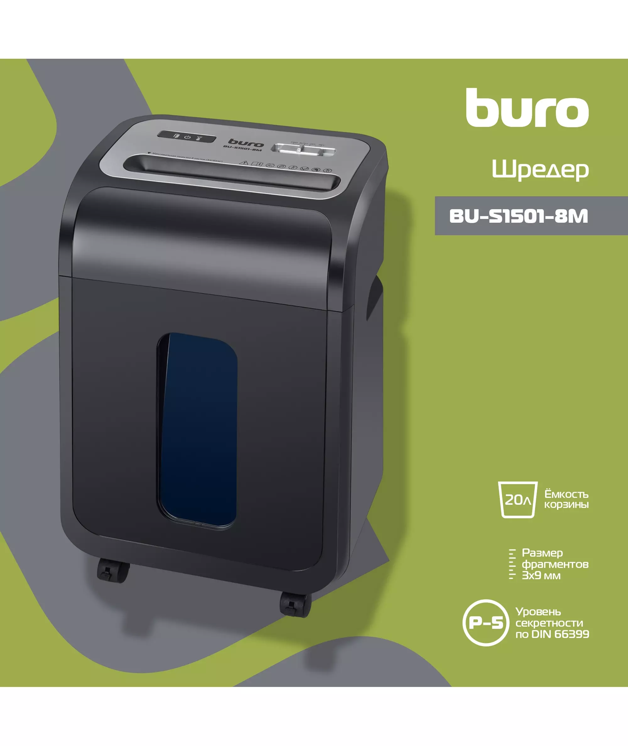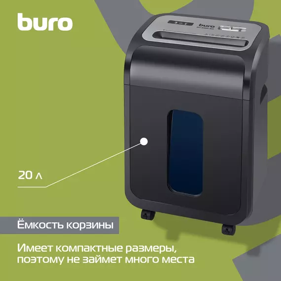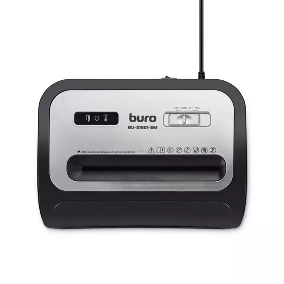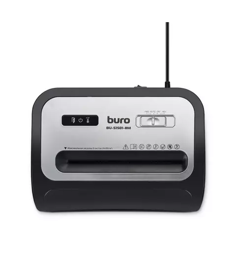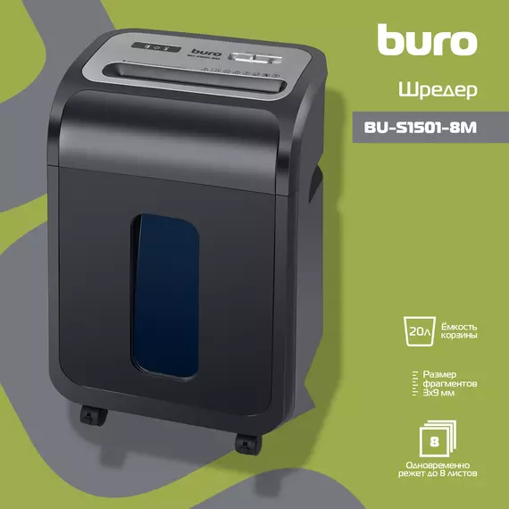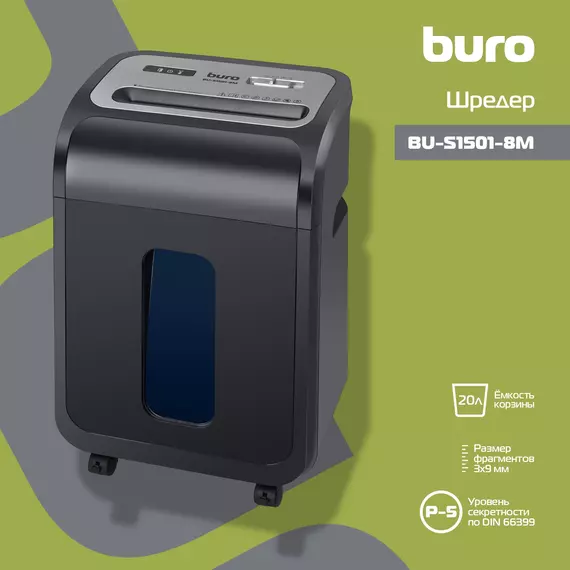 Шредер BURO BU-S1501-8M Office черный (секр.P-5) фрагменты 8лист. 20лтр. скрепки скобы пл.карты