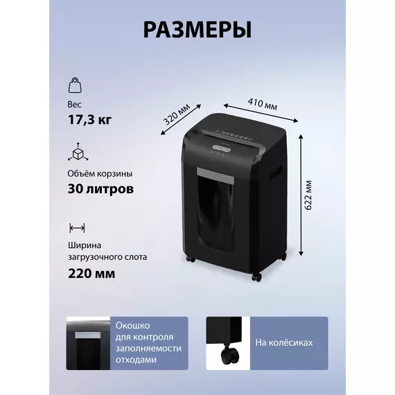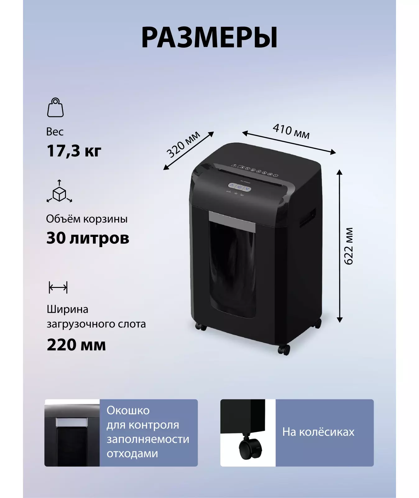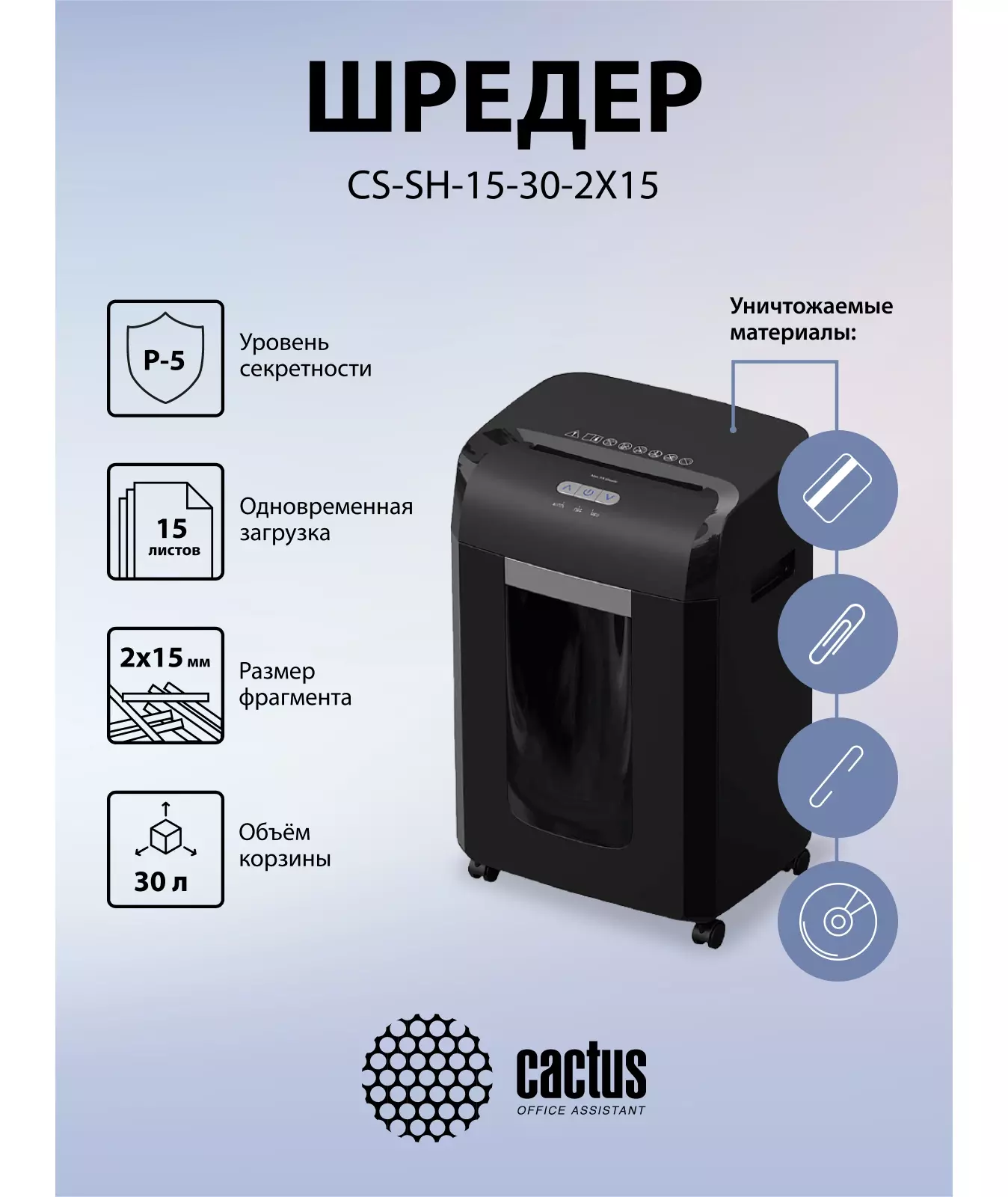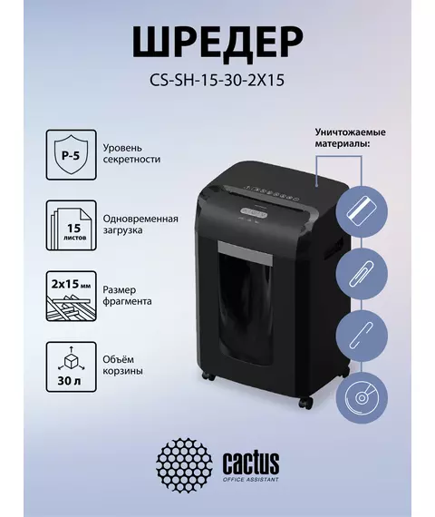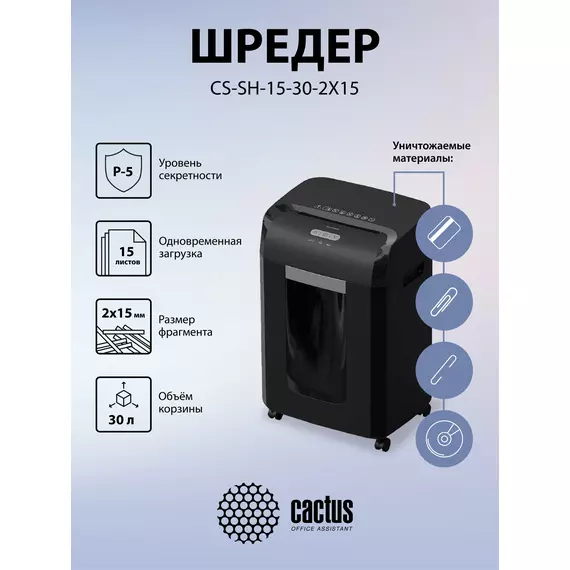 Шредер Cactus CS-SH-15-30-2X15 (секр.P-5) фрагменты 15лист. 30лтр. скрепки скобы пл.карты CD