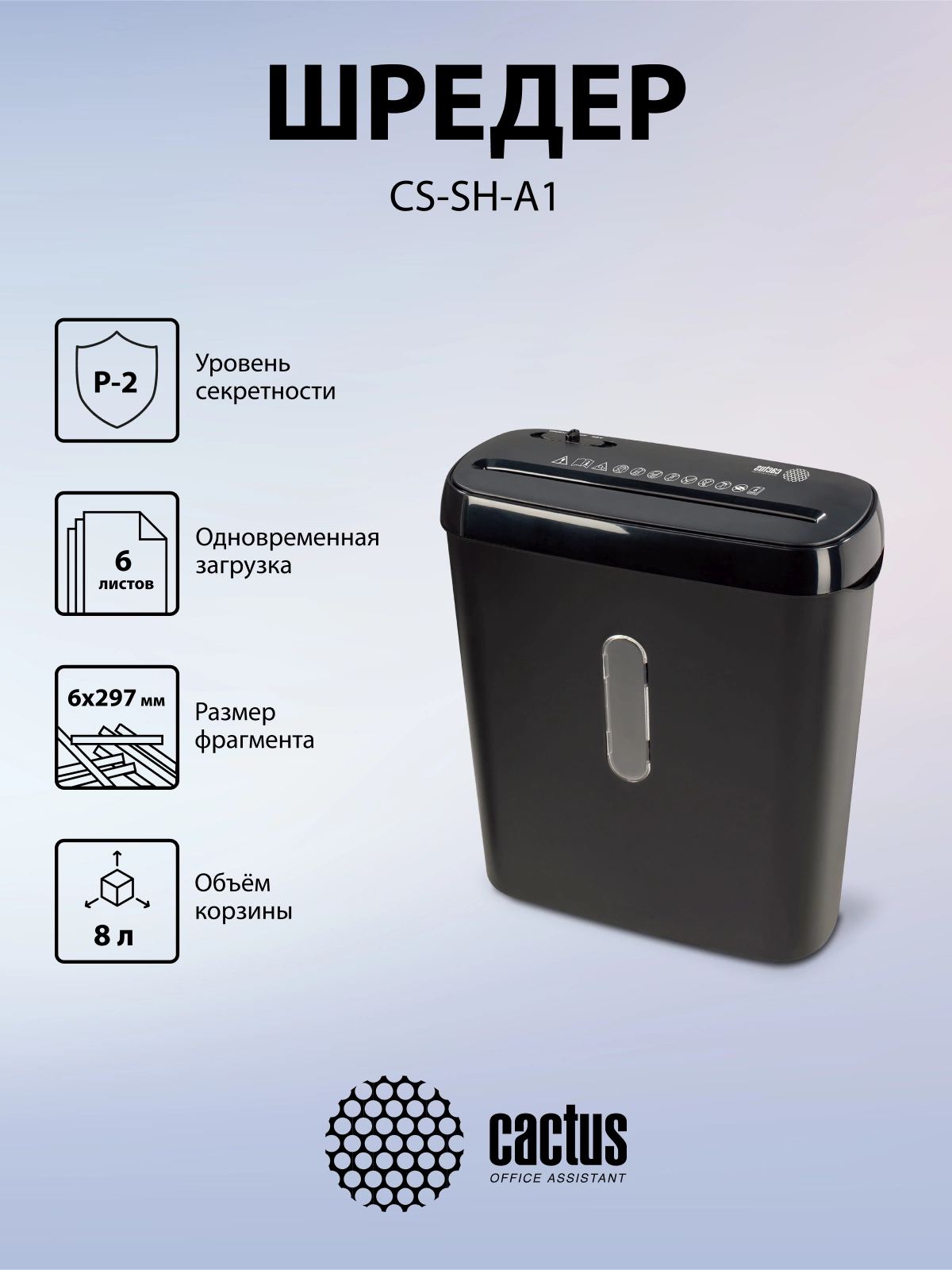 Шредер Cactus CS-SH-A1 секр.Р-2 ленты 6.лист. 8лтр.