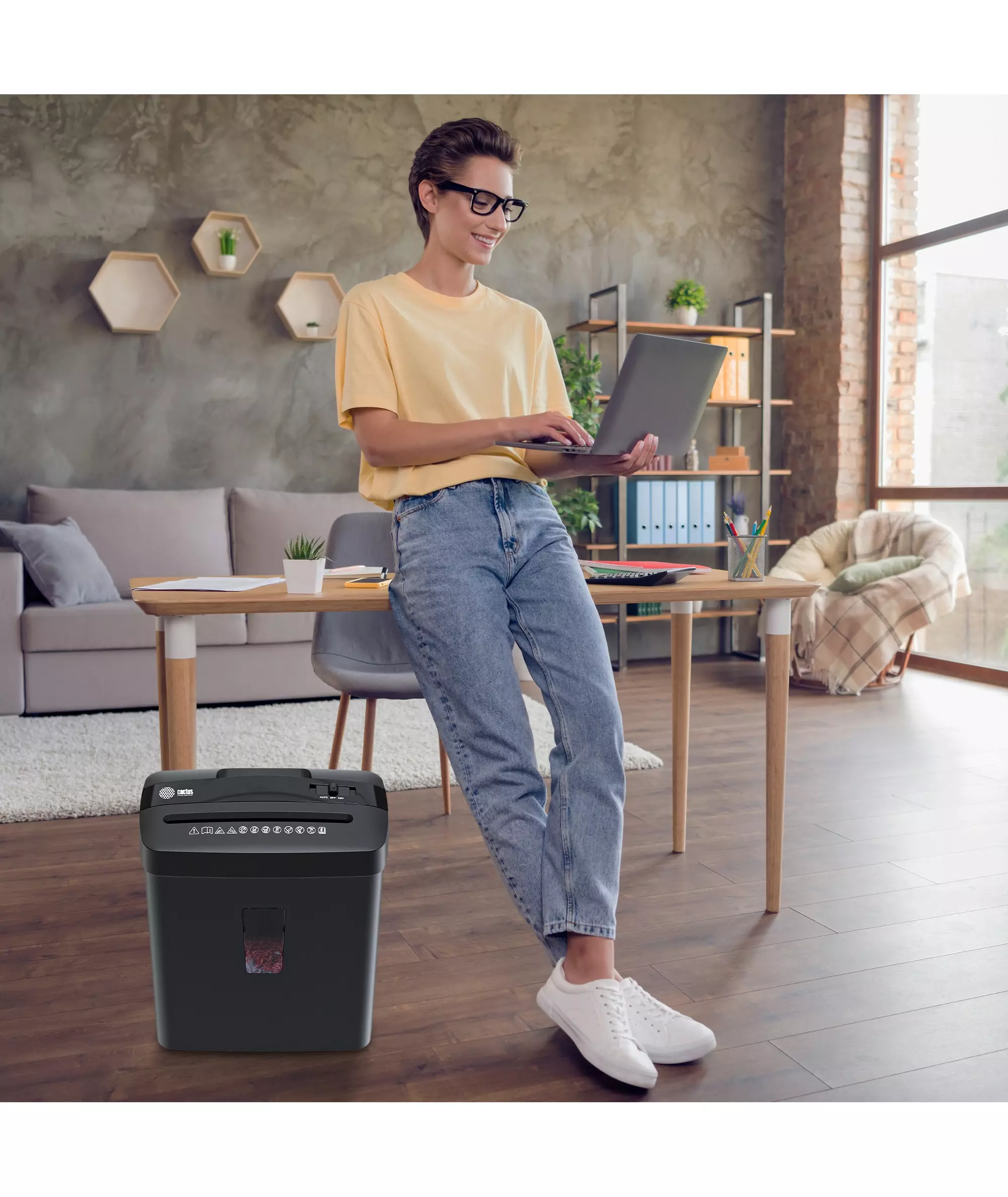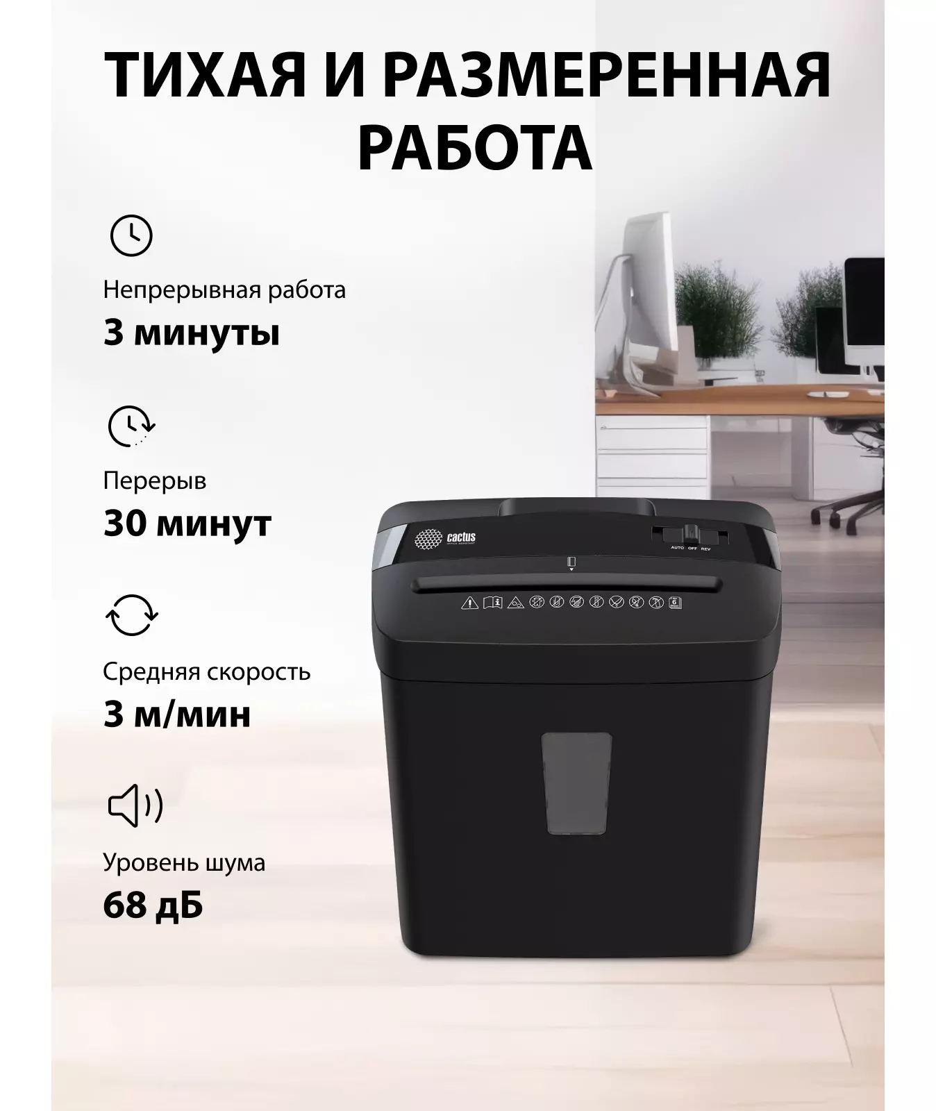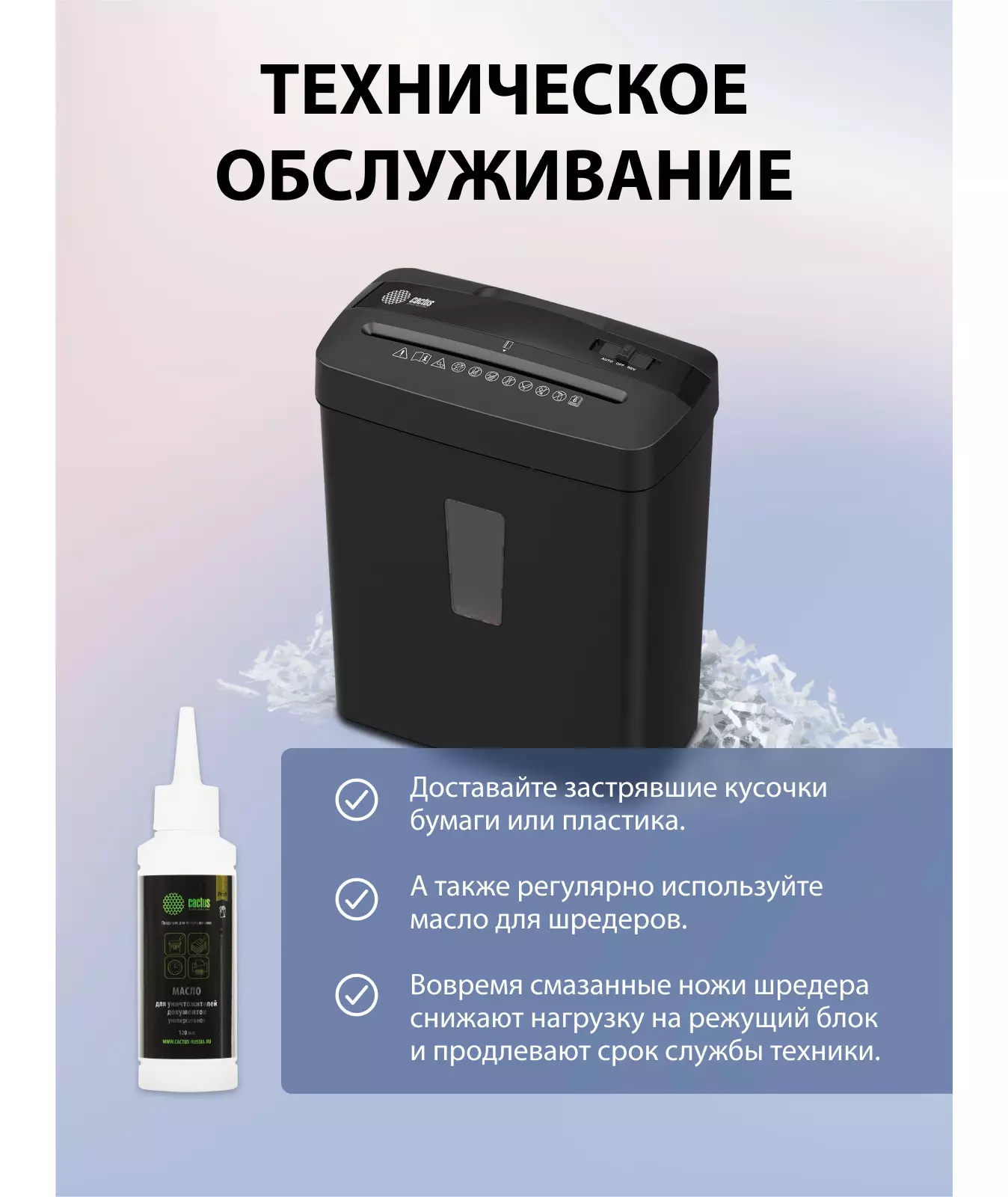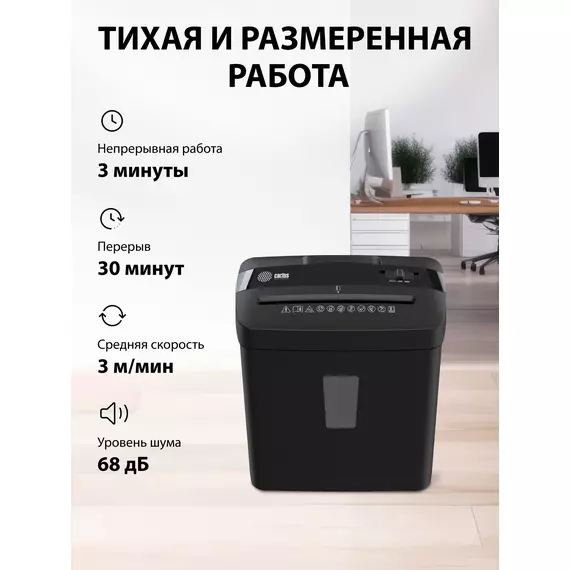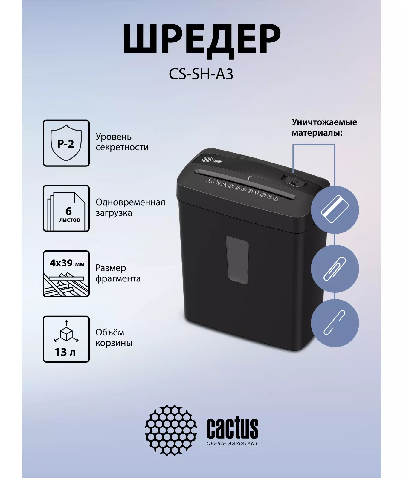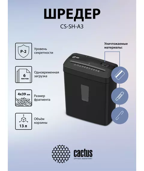 Шредер Cactus CS-SH-A3 (секр.P-4) фрагменты 6.лист. 13лтр. скобы пл.карты