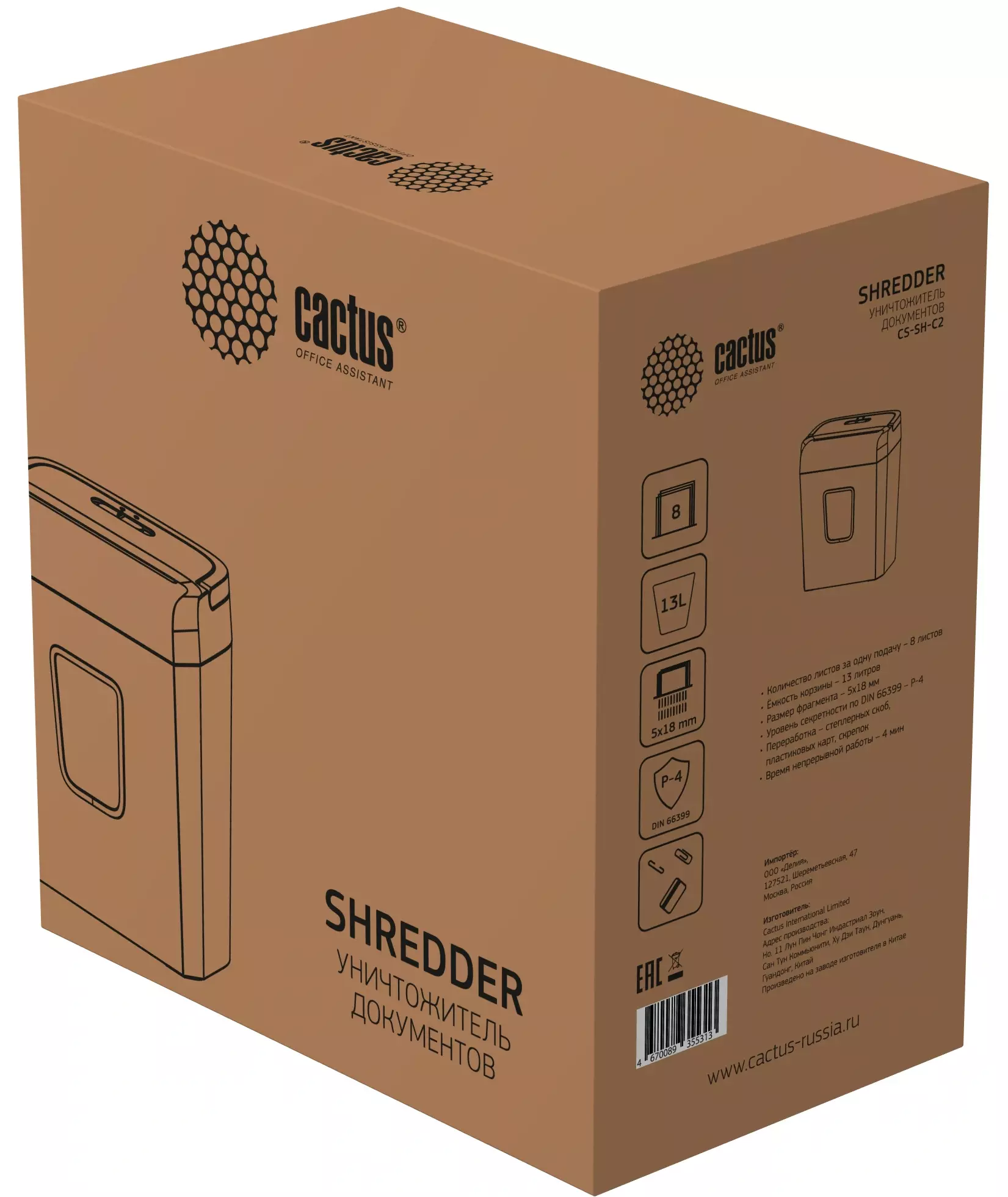 Шредер Cactus CS-SH-C2 черный (секр.P-4) фрагменты 8лист, 13лтр, скрепки, скобы, пл.карты