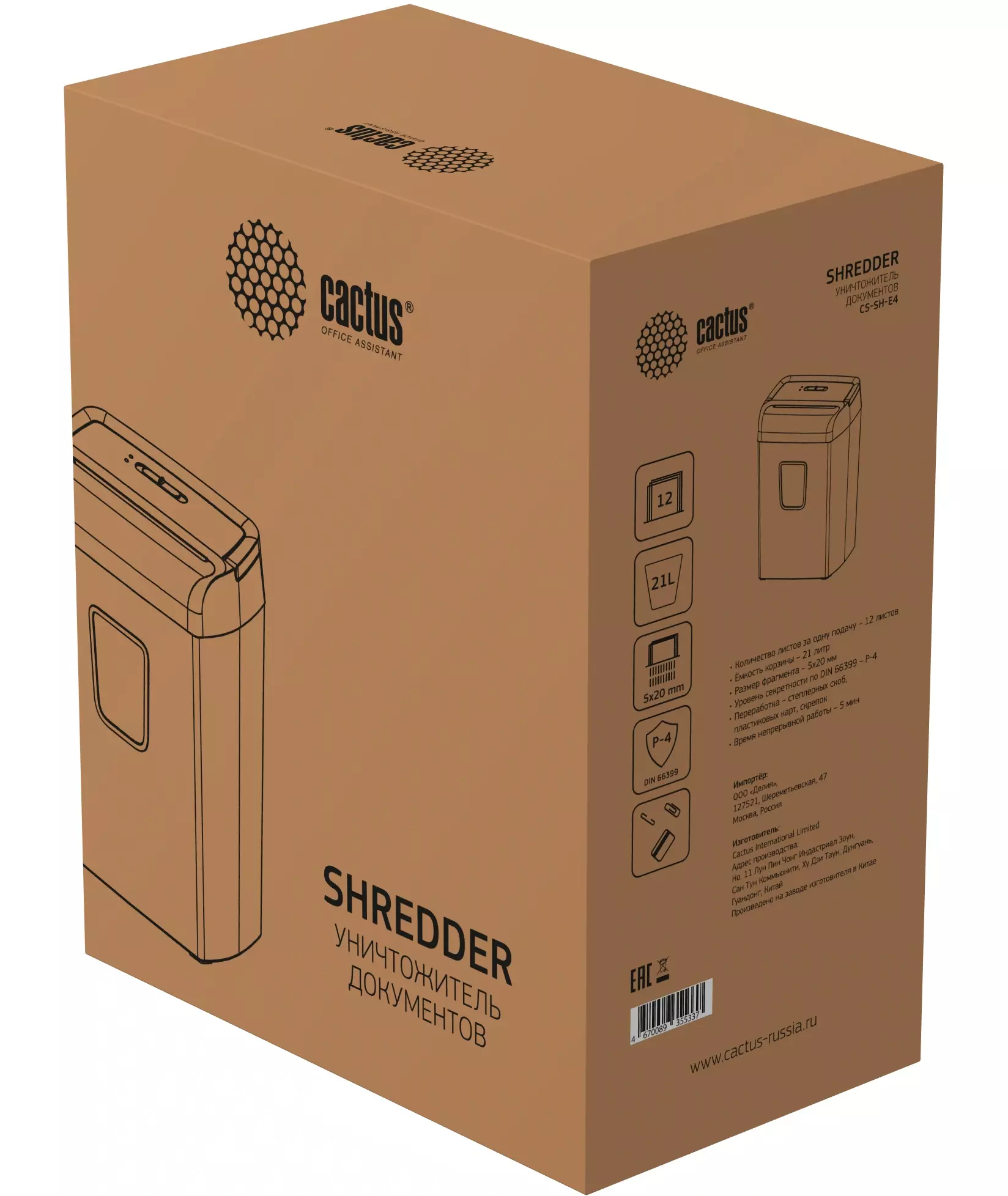 Шредер Cactus CS-SH-E4 секр.P-4 фрагменты 12лист 21лтр скрепки скобы пл.карты