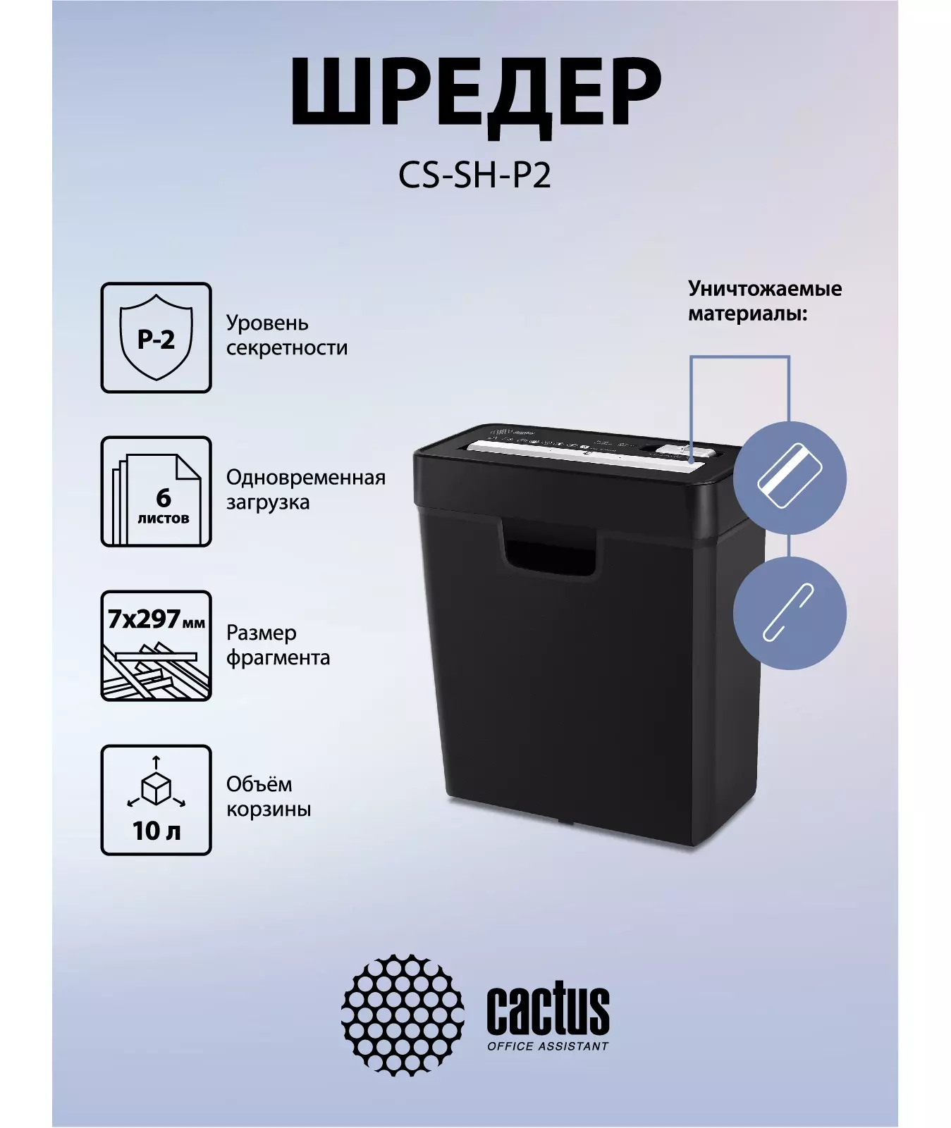Шредер Cactus CS-SH-P2 черный (секр.Р-2) ленты 6лист. 10лтр. скобы пл.карты