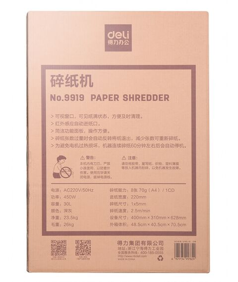 Шредер Deli Deli 9919 серый с автоподачей (секр.P-7) фрагменты 8лист. 30лтр. скрепки скобы пл.карты CD [9919]